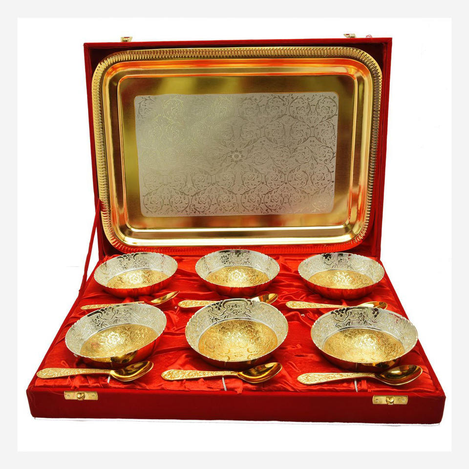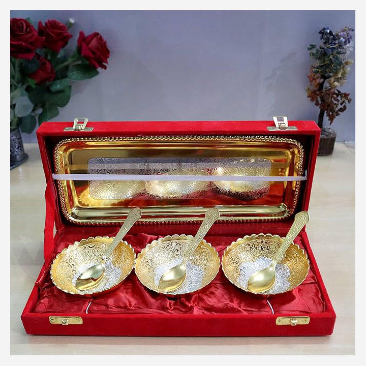 ชุดเสิร์ฟพร้อมชามสี่ช้อนและถาดโลหะทองเหลืองสีเงินพร้อมช้อนและถาดที่ดีที่สุดกล่องบรรจุสีแดงเงาชามราชวงศ์