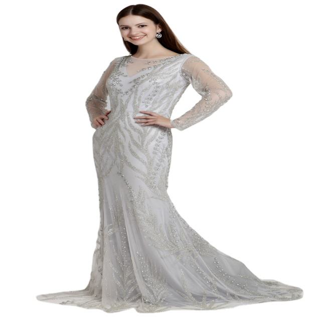 ชุดราตรียาวประดับด้วยเงินแขนยาวสำหรับผู้หญิงคอเสื้อเต็มตัวปักมือธรรมชาติสำหรับงานปาร์ตี้พรมแดงงานแต่งงาน