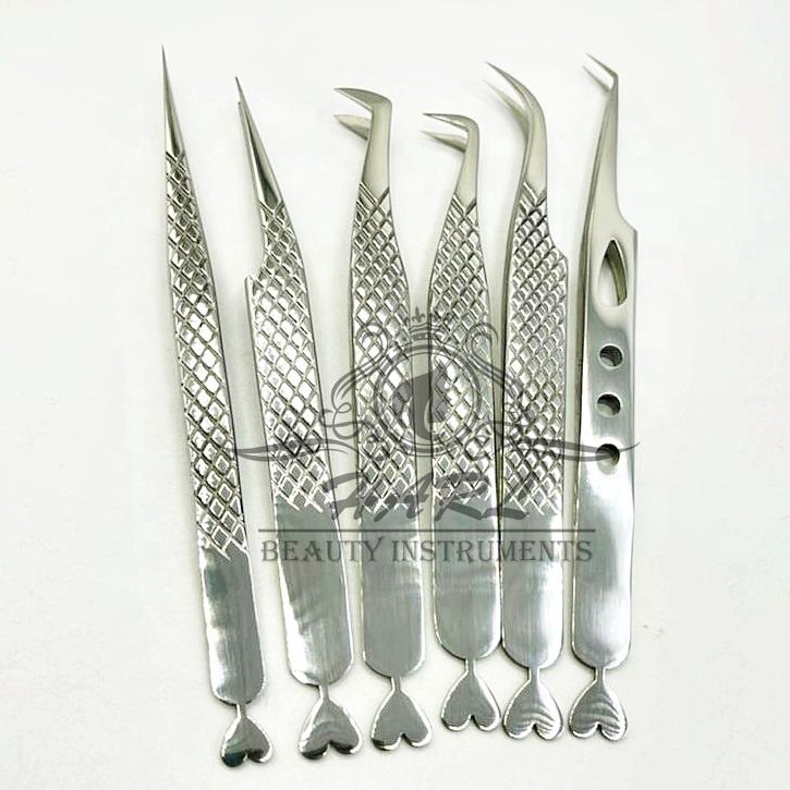 แหนบต่อขนตาสแตนเลสแบบใช้สองสีเงินอุปกรณ์เสริมความงามทรงหัวใจพร้อมปลายเส้นใยปริมาณการยกคิ้ว