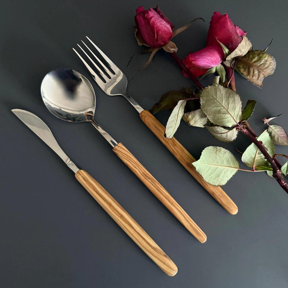 ชุดช้อนส้อมสำเร็จรูปสีเงินพร้อมด้ามไม้เครื่องใช้บนโต๊ะอาหารหรูหราสำหรับรับประทานอาหารห้องครัวร้านอาหารงานแต่งงานตกแต่งโต๊ะ