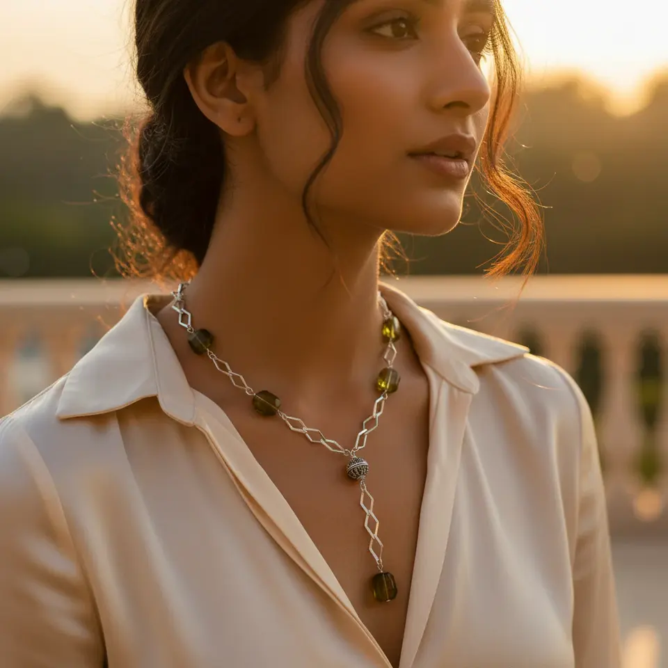สร้อยคอทรงเรขาคณิตประดับลูกปัดเงิน พร้อมพลอยสีเขียวและไข่มุกน้ำจืด สไตล์ทันสมัยแบบศาสนา เหมาะสำหรับงานแต่งงาน งานเลี้ยง หรือเป็นของขวัญ