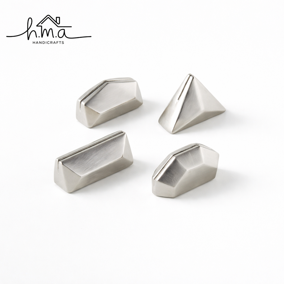ชุดที่ใส่บัตรโลหะทรงเรขาคณิตสีเงิน รูปทรงเหลี่ยมหลายเหลี่ยม ปริซึม ทรงพีระมิด ดีไซน์มินิมอล สำหรับวางบนโต๊ะ ใช้โชว์นามบัตรหรือรูปภาพ