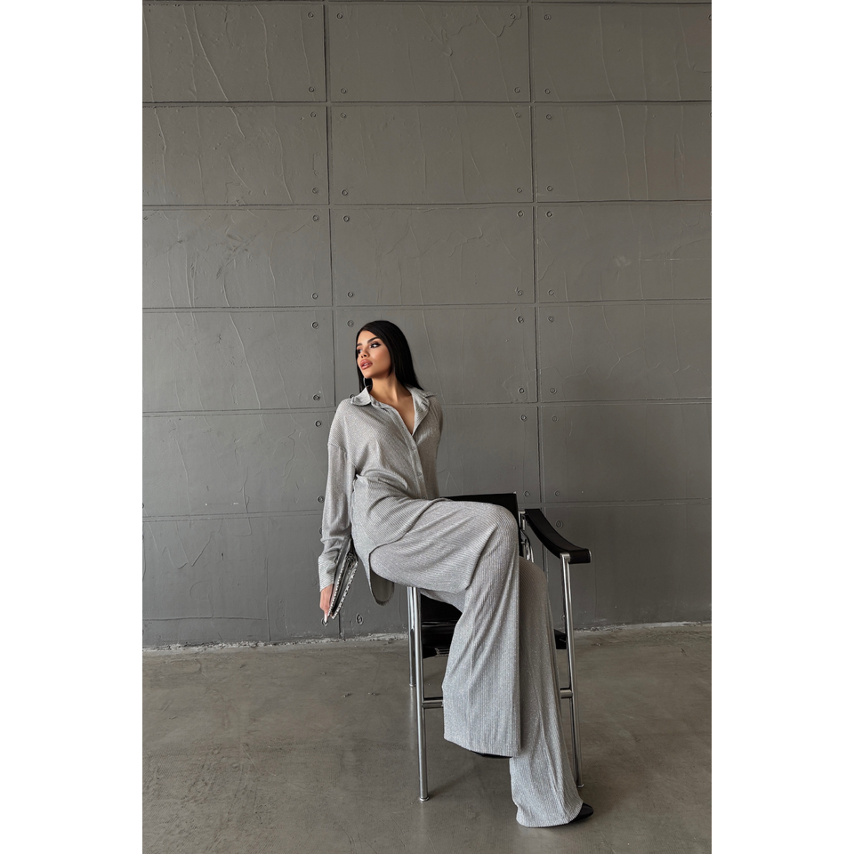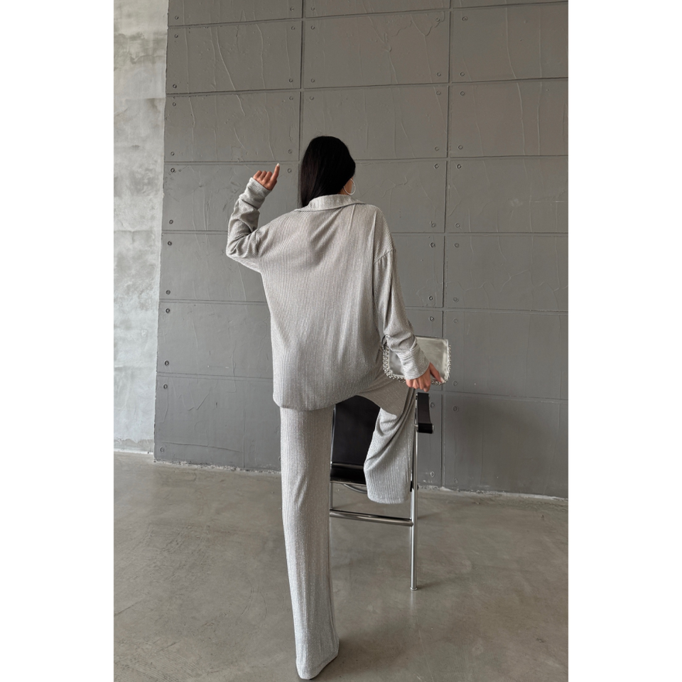 ชุดเสื้อและกางเกงผู้หญิงสีเงินวิบวับ