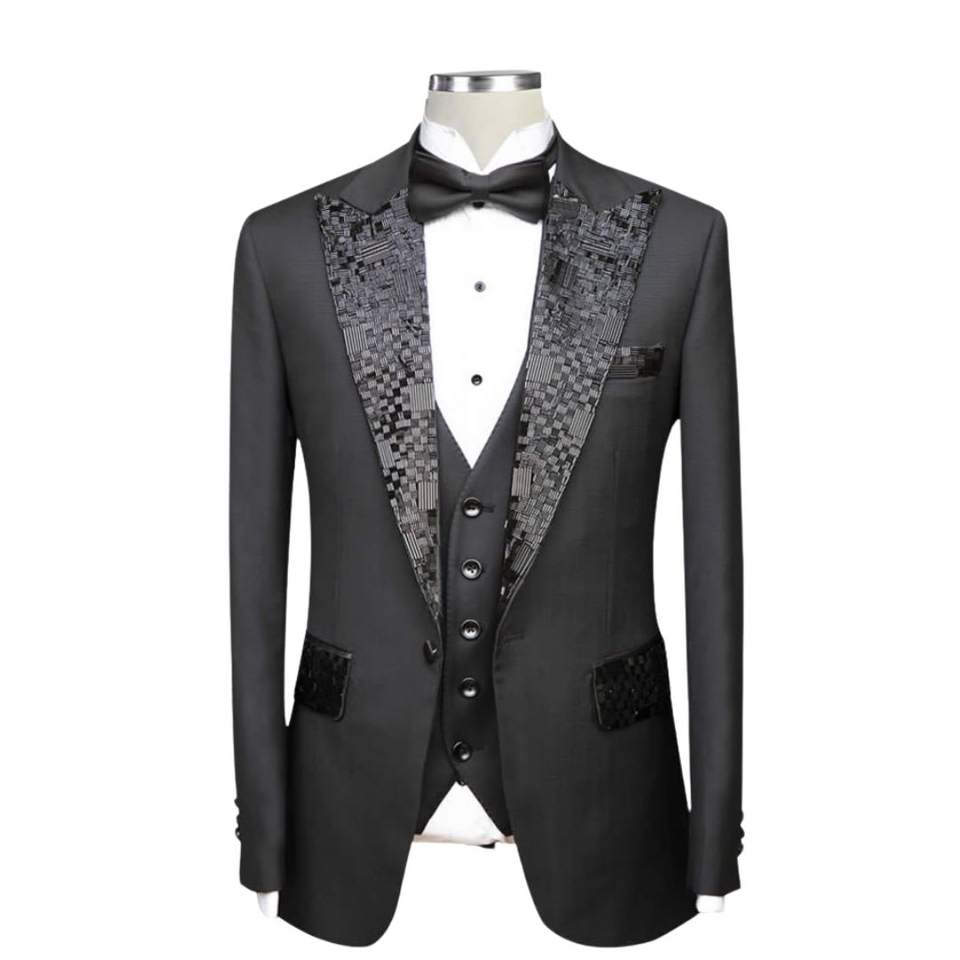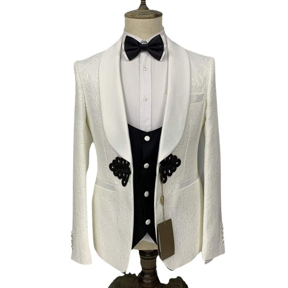 ชุดทักซิโด้ผู้ชายสีเงินเทา ลายดอกไม้ ปกแหลม ผ้าแจ็คการ์ด 3 ชิ้น ชุดหรูสำหรับงานปาร์ตี้ ชุดเจ้าบ่าวงานแต่งงาน