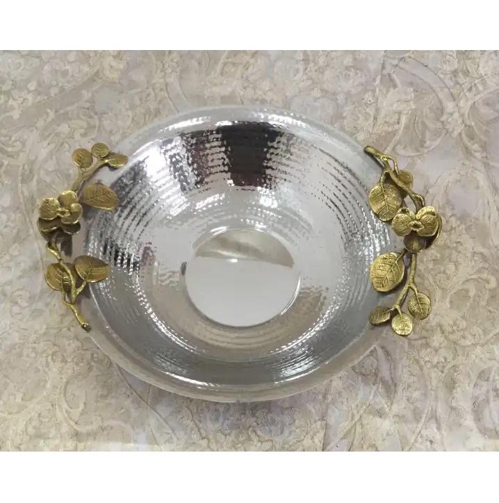 ชามเสิร์ฟสีเงินตอกผลไม้บนโต๊ะอาหารตกแต่งเสิร์ฟจานและชามสําหรับใช้ในบ้านและร้านอาหาร