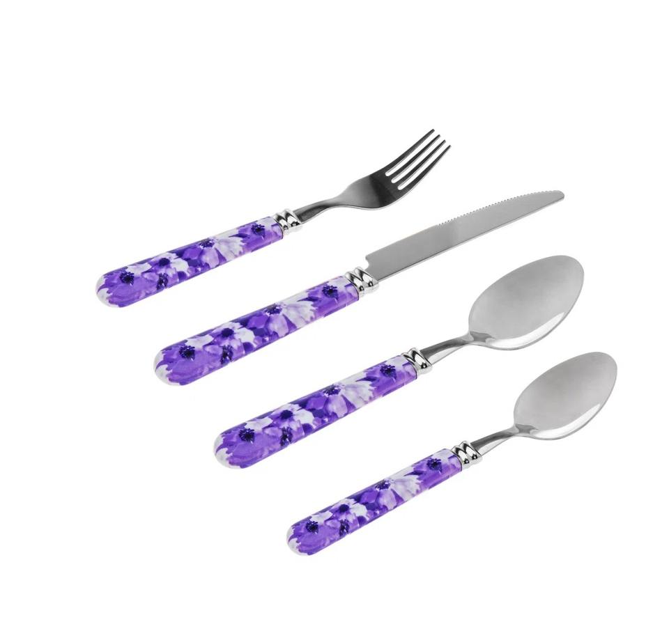 ชุดช้อนส้อมหัวสีเงินพร้อมที่จับสีม่วงพิมพ์ลายดอกไม้สแตนเลสสำหรับรับประทานอาหารห้องครัวบ้านร้านอาหาร