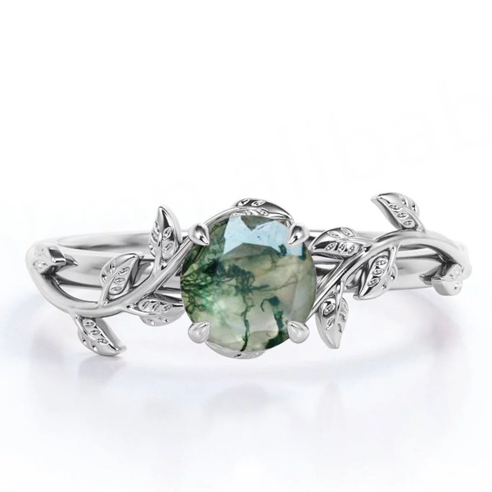 แหวนหมั้นชุบเงินประดับด้วยหินเดี่ยว 4 ขา ทรงเหลี่ยม หินดรูซี่สีขาวขุ่น ประดับด้วยอาเกตสีเขียวมอส ดีไซน์รูปใบไม้ สำหรับงานแต่งงาน