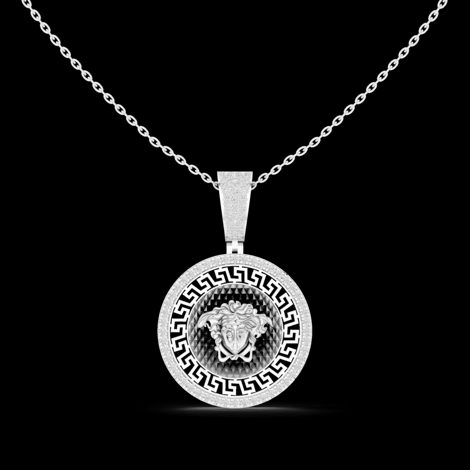 จี้เพชรเมดูซ่าสีเงินลายกรีกประดับเพชรระยิบระยับ ดีไซน์เทพนิยายสุดโดดเด่น เหมาะสำหรับงานแต่งงานและงานปาร์ตี้ สไตล์หรูหรา
