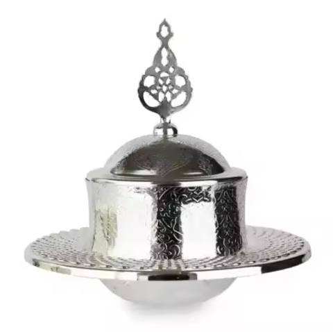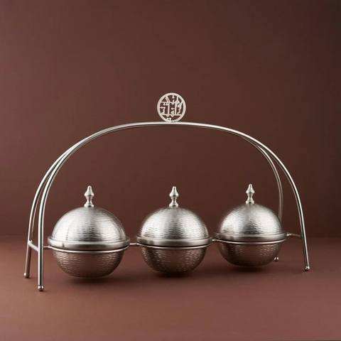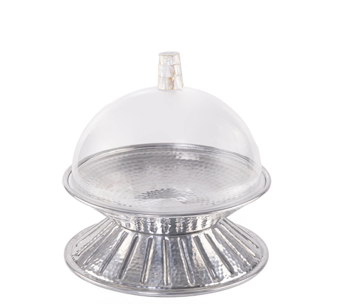 ถ้วยเสิร์ฟขนมหรูหราแบบใช้แล้วทิ้งทำจากโลหะเงินฝาปิดลูกบิดมุกทันสมัยสำหรับวางบนโต๊ะอาหาร