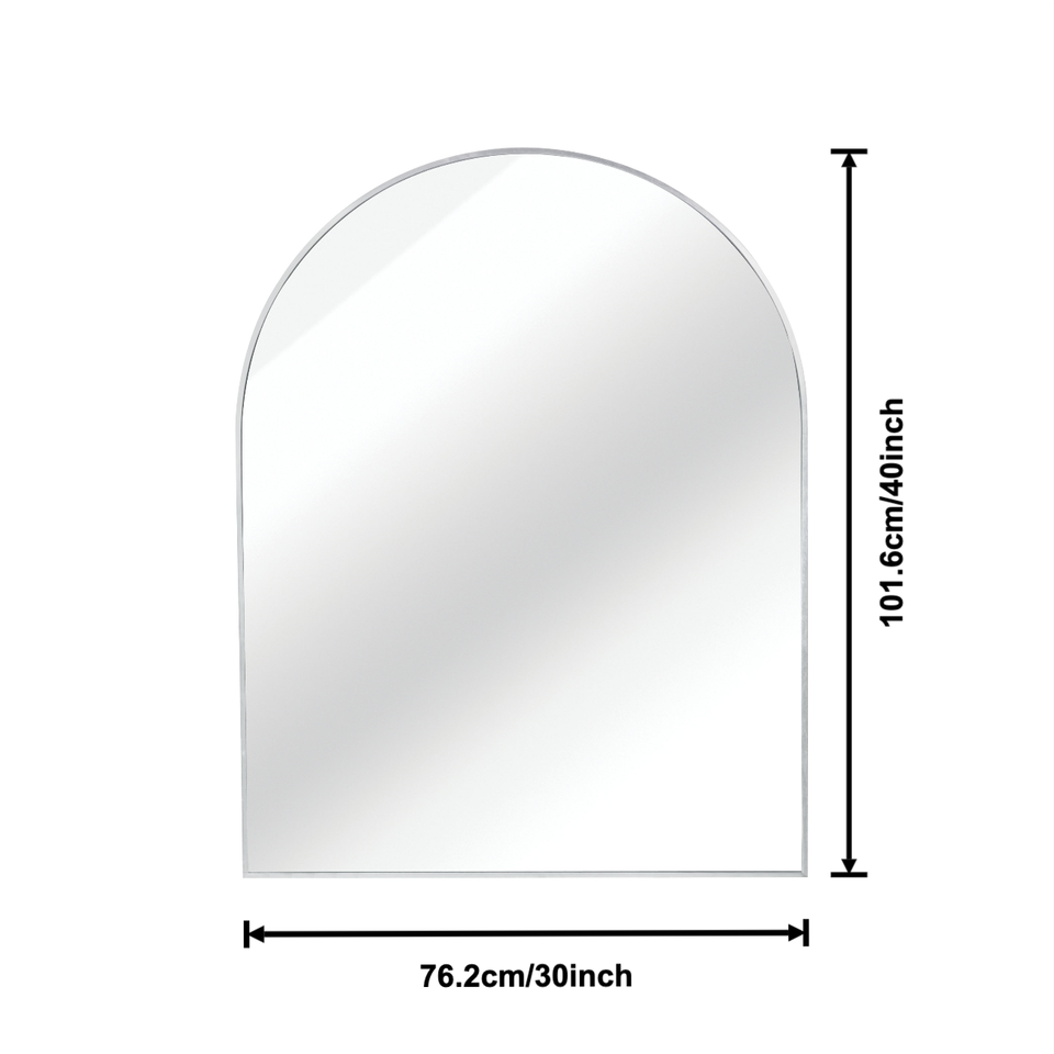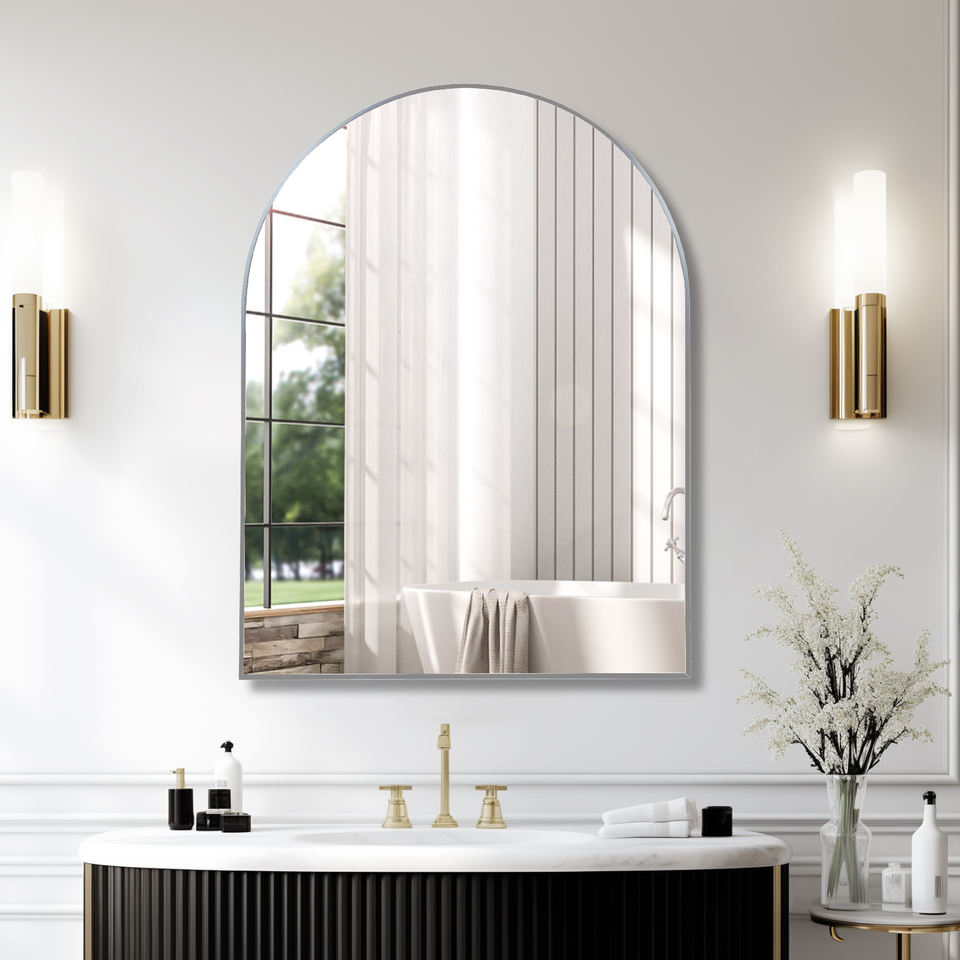 กระจกห้องน้ำทรงโค้งกรอบโลหะสีเงิน ขนาด 30x40 นิ้ว สำหรับติดผนัง