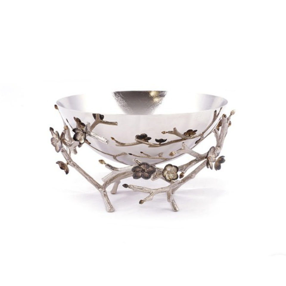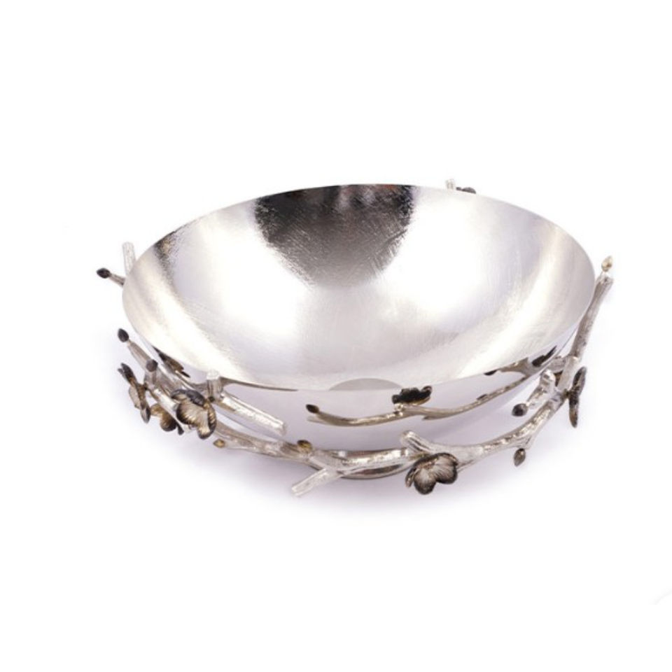 ชามโลหะเงินพร้อมดีไซน์รูปดอกไม้และกิ่งไม้ชามสำหรับตกแต่งผลไม้และถั่ว