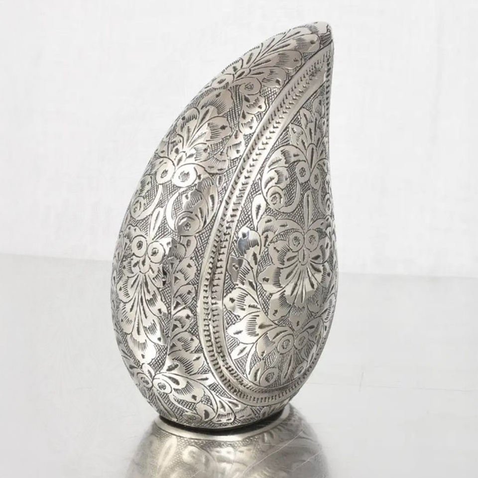 Silver Metal Teardrop Cremation Ashes Urn with Embossed Design Perfect for Mini Keepsake and Bulk Wholesale Memorial Supplies