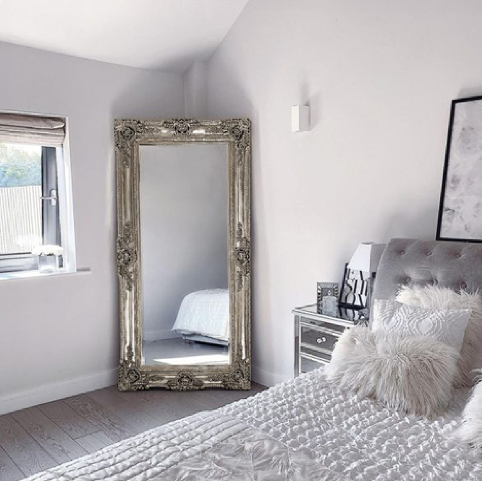 กระจกบานยาวเต็มตัวสไตล์ฝรั่งเศสสีเงินหรูหราพร้อมรายละเอียดลายนูนสำหรับตกแต่งห้องนอนมีจำหน่ายในราคาขายส่ง