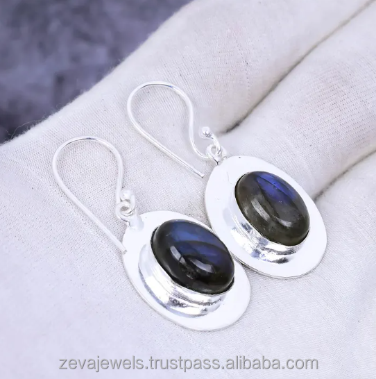 ชุดกรอบรูปทรงรีสีเงินต่างหูแลบราโดไรต์ทรงโบฮีเมียนเครื่องประดับต่างหูตะขอเกี่ยวเป็นครั้งคราว