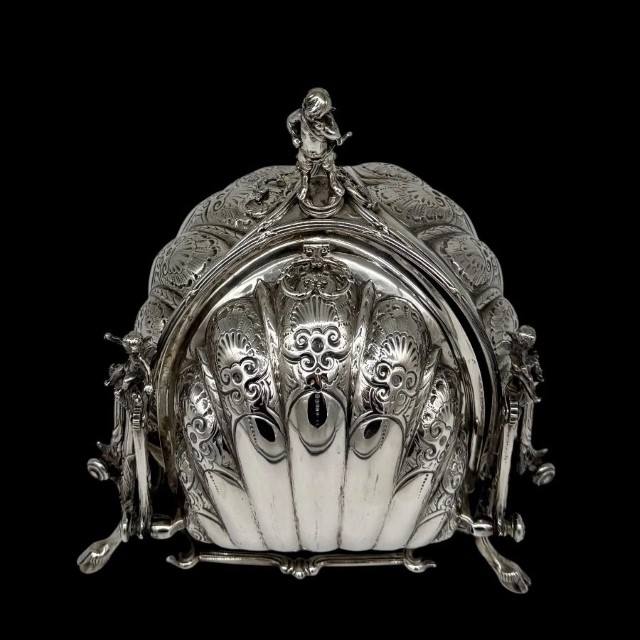 กล่องบิสกิตพับเปลือกคู่ชุบเงินกล่องบิสกิตสไตล์วิกตอเรียหรูหราพร้อมสลักและท็อปเปอร์รูปแกะสลัก
