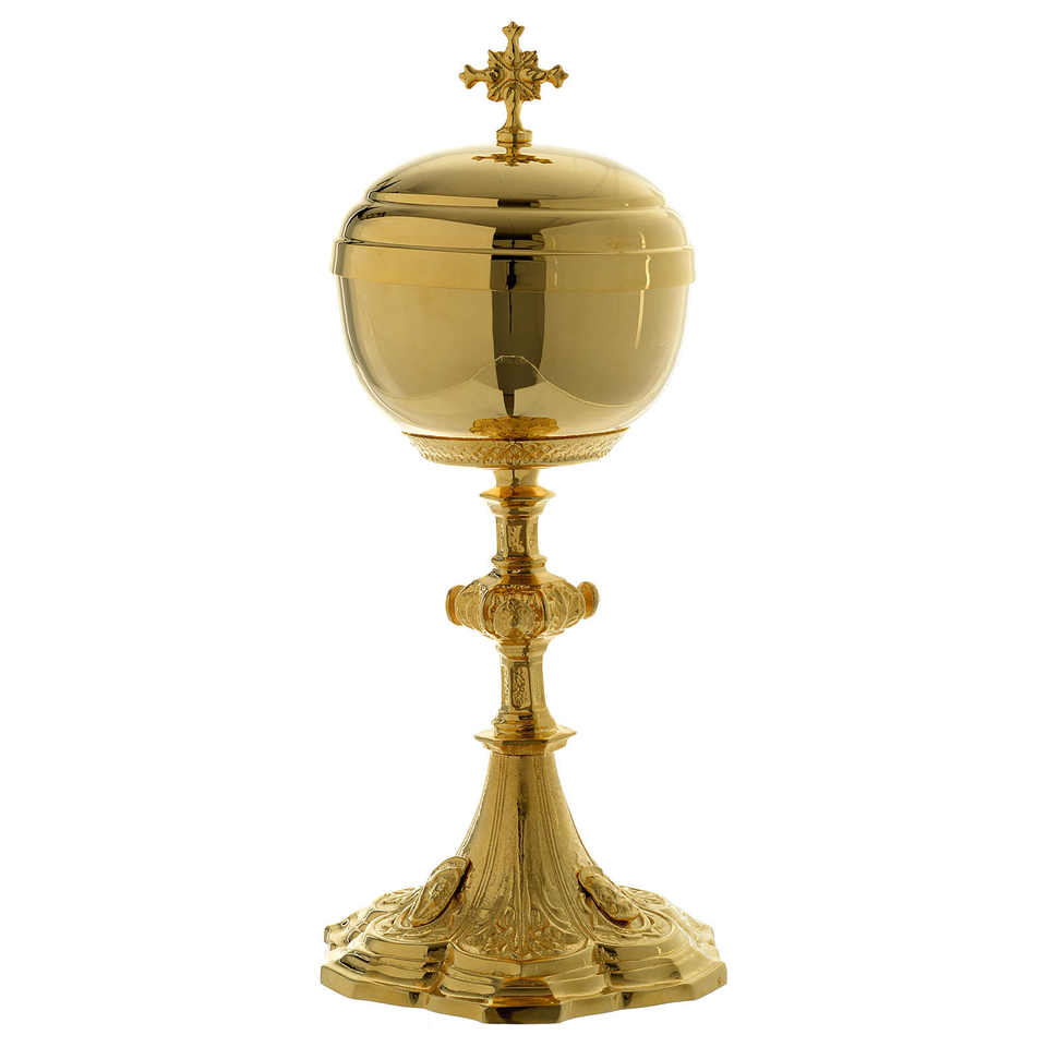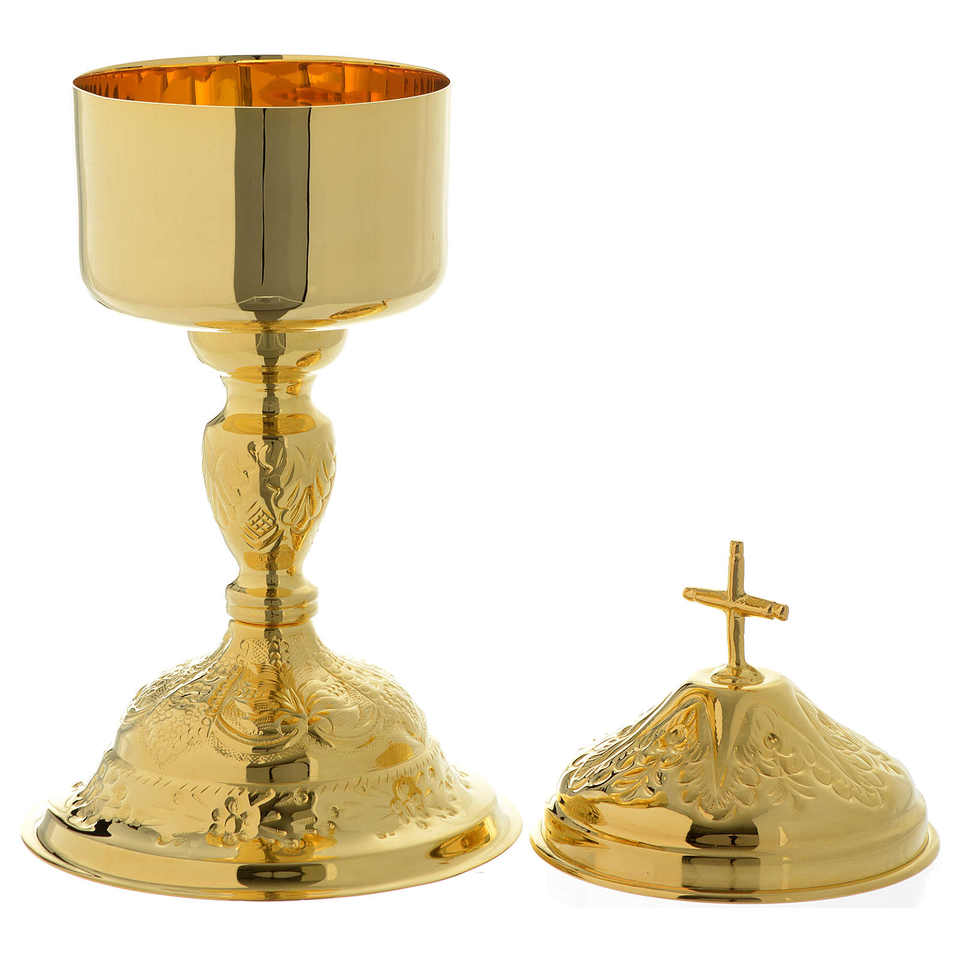 Ciborium ทองเหลืองออกแบบลายนูนชุบเงินสำหรับงานฝีมือทางศาสนาอุปกรณ์ตกแต่งโบสถ์