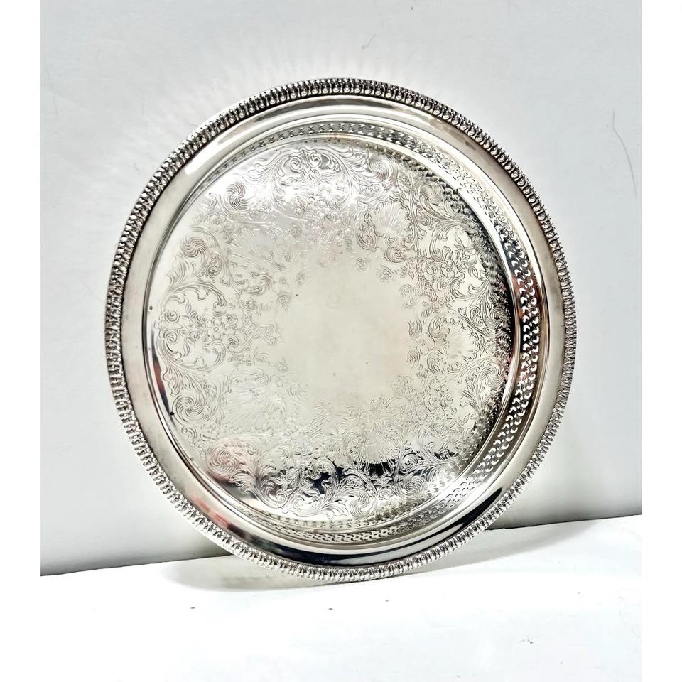 ถาดชุบเงินขอบฉลุลาย จานเสิร์ฟเงินโบราณ ว.ม. ถาดแกะสลักตกแต่งโรเจอร์ส