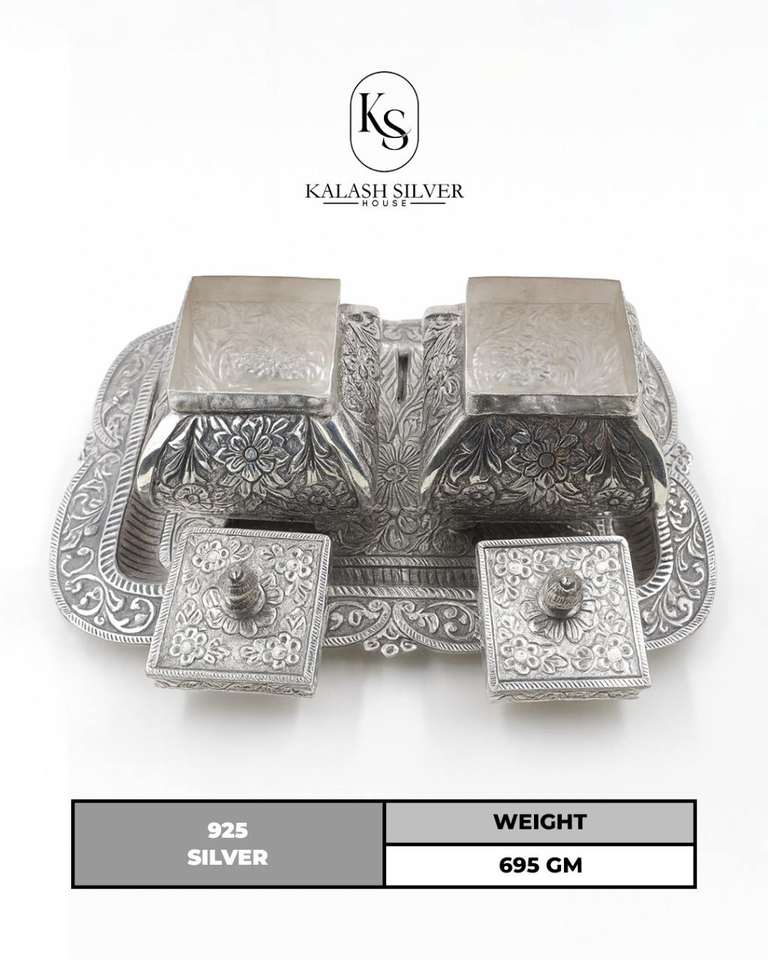 ชุดกล่องพูจาสีเงินจาก Kalash Silver House น้ำหนัก 695 กรัม ดีไซน์ลายดอกไม้ทำมือ พร้อมถาด สำหรับจัดเก็บแบบดั้งเดิมสำหรับบ้านและหิ้งพระ