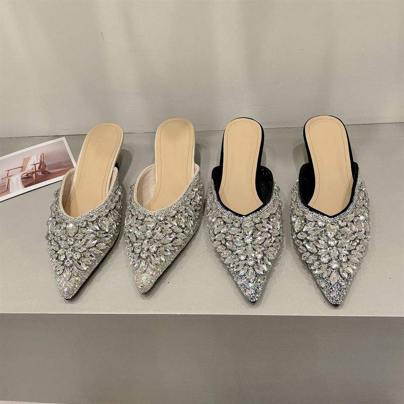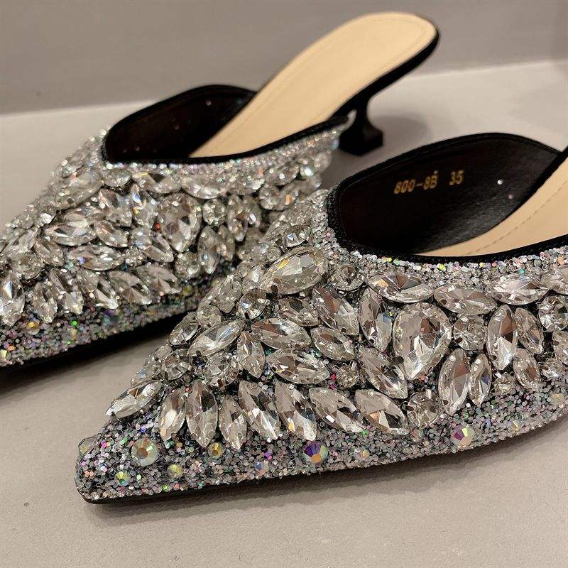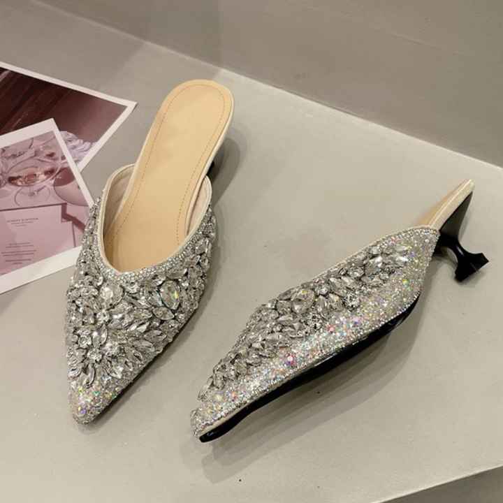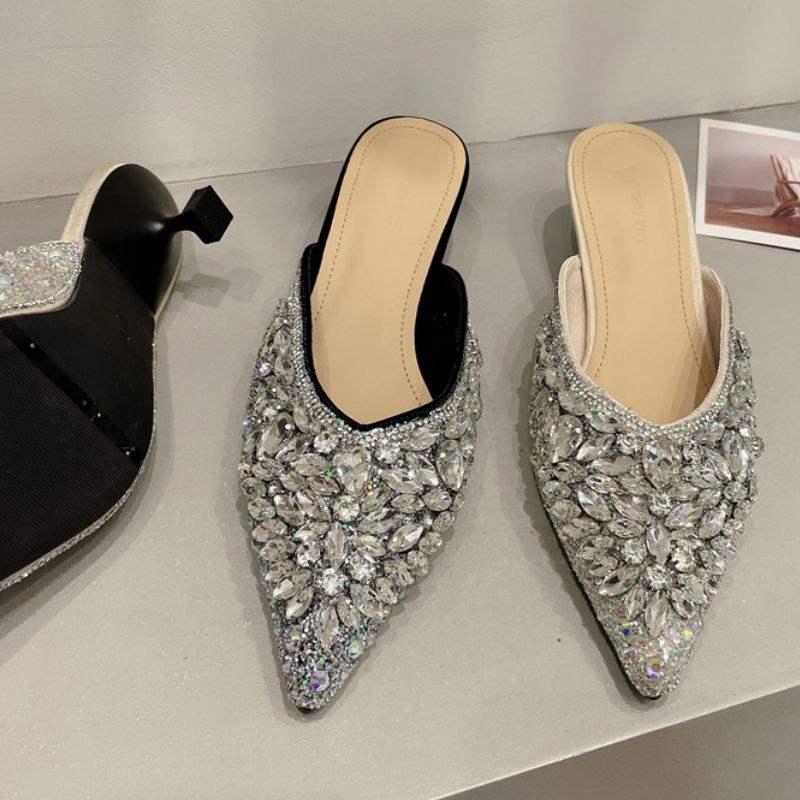 รองเท้าส้นเตี้ยประดับคริสตัลสีเงิน ดีไซน์หรูหรา สำหรับผู้หญิง