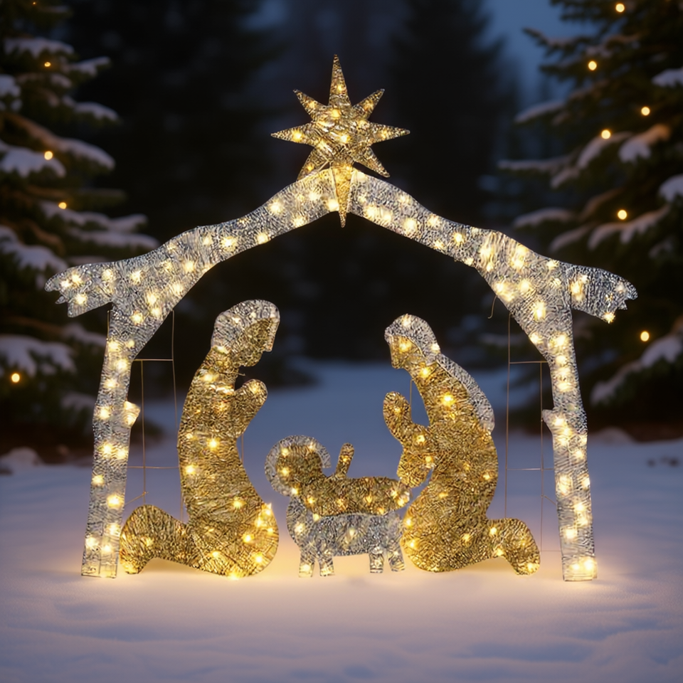 ฉากพระกุมารบนหลังคาสีเงิน ขนาด 6 ฟุต พร้อมไฟ LED ตกแต่งคริสต์มาส สำหรับสวนภายนอก ดีไซน์โลหะแบบดั้งเดิม