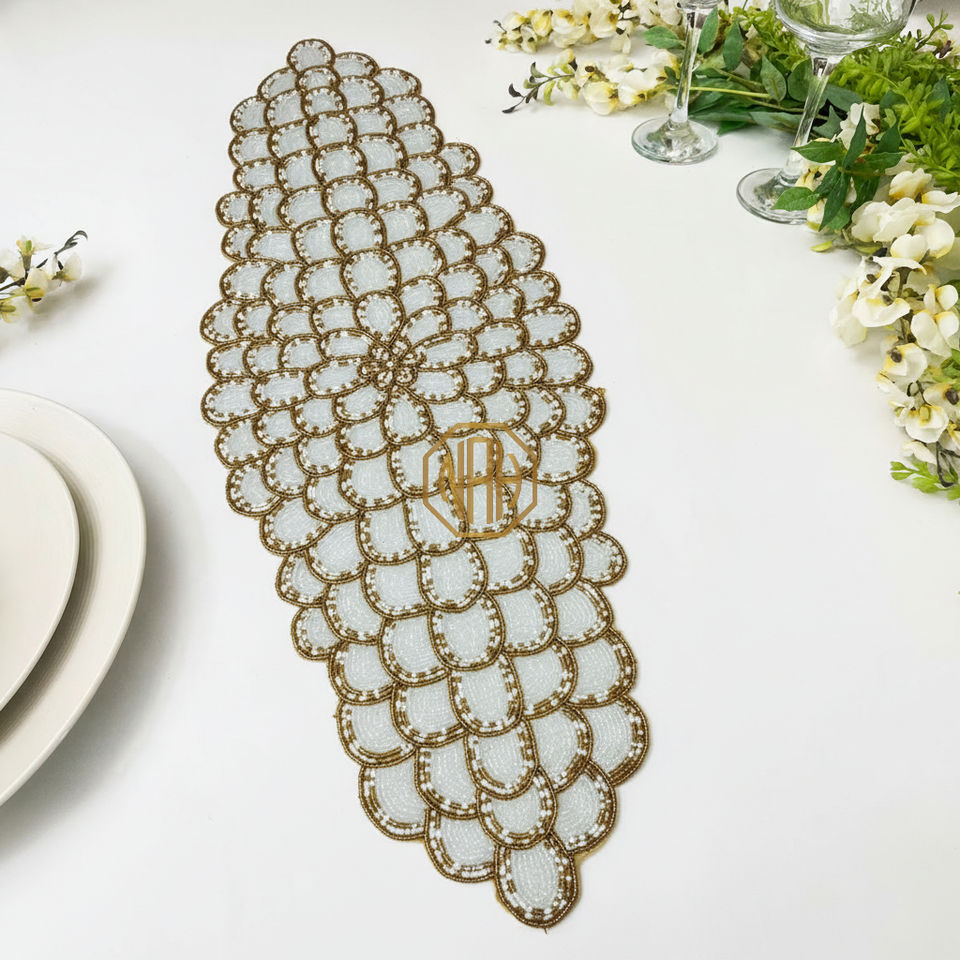 Silver and Black Beaded Table Runner Placemat Handmade Embroidered Multicolor Floral B2B