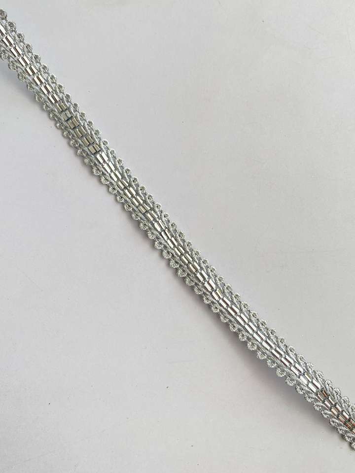 ขอบลูกไม้สีเงินเมทัลลิกประดับด้วยลูกปัดเงา กว้าง 1.25 นิ้ว สำหรับกระเป๋าและของตกแต่งบ้าน-ขายส่ง