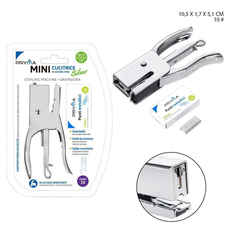 Silver stapler 10.5x1.7x5.1cm with 1000 P10 staples for office