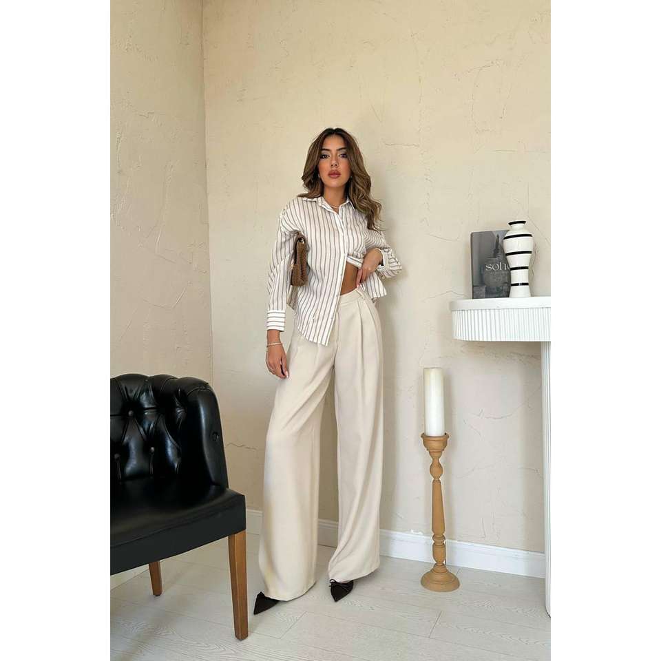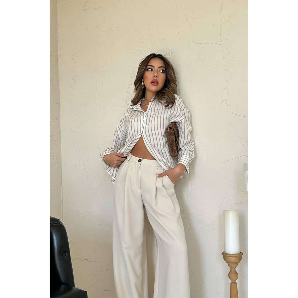 เสื้อเชิ้ตผู้หญิงสีเบจลายทางเรียบง่าย กระดุมผ่าหน้า ผ้าป๊อปลิน สวมใส่สบายทุกวัน แขนยาว ทรงหลวม แฟชั่นทันสมัย