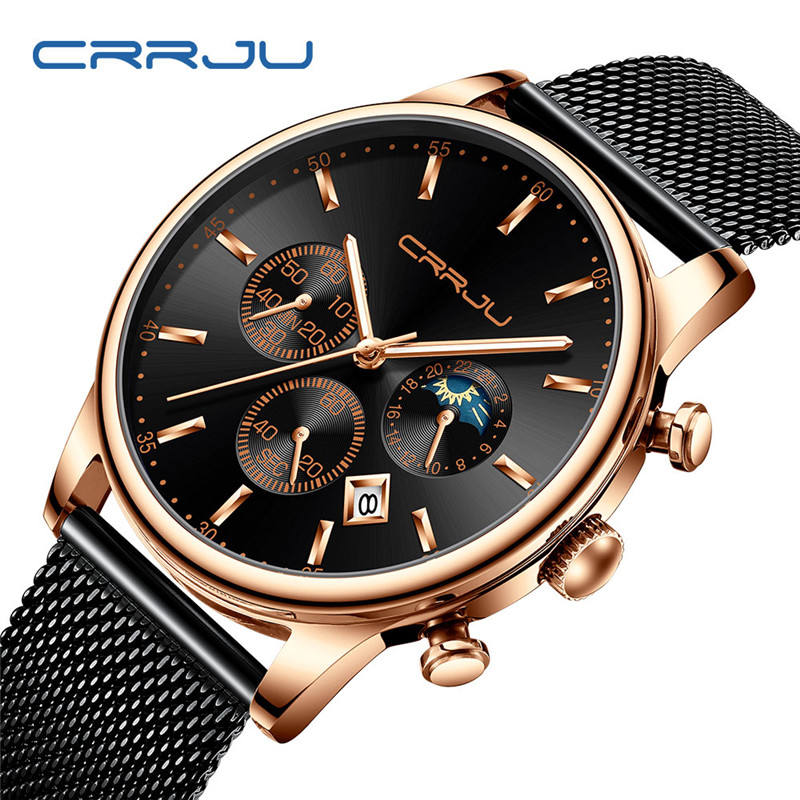 นาฬิกาข้อมือควอตซ์แฟชั่น CRRJU 2266 สีโรสโกลด์ สายตาข่าย ดีไซน์สามหน้าปัด กันน้ำ รุ่นเรียบง่าย สำหรับผู้ชาย