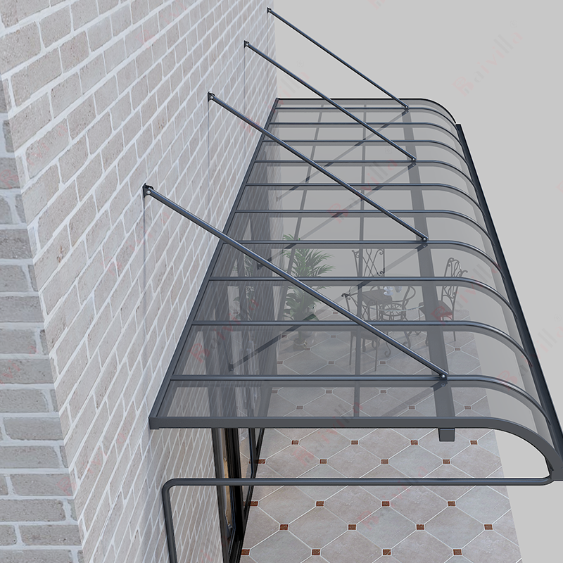 ระบบกันสาดโครงอลูมิเนียมแบบเรียบง่ายแผงโพลีคาร์บอเนตกลางแจ้งแบบมีหลังคาทรงเอียงติดตั้งง่ายกันสาดแบบชายคา