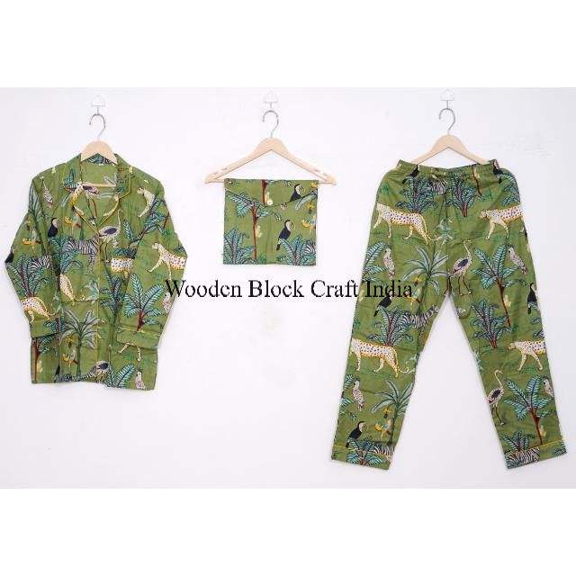 ชุดนอนผ้าฝ้ายลายดอกไม้ดีไซน์เรียบง่าย พิมพ์ลายป่าด้วยเทคนิคแฮนด์บล็อก สำหรับผู้หญิง ชุดนอนฤดูร้อนน้ำหนักเบา เหมาะสำหรับใส่นอน