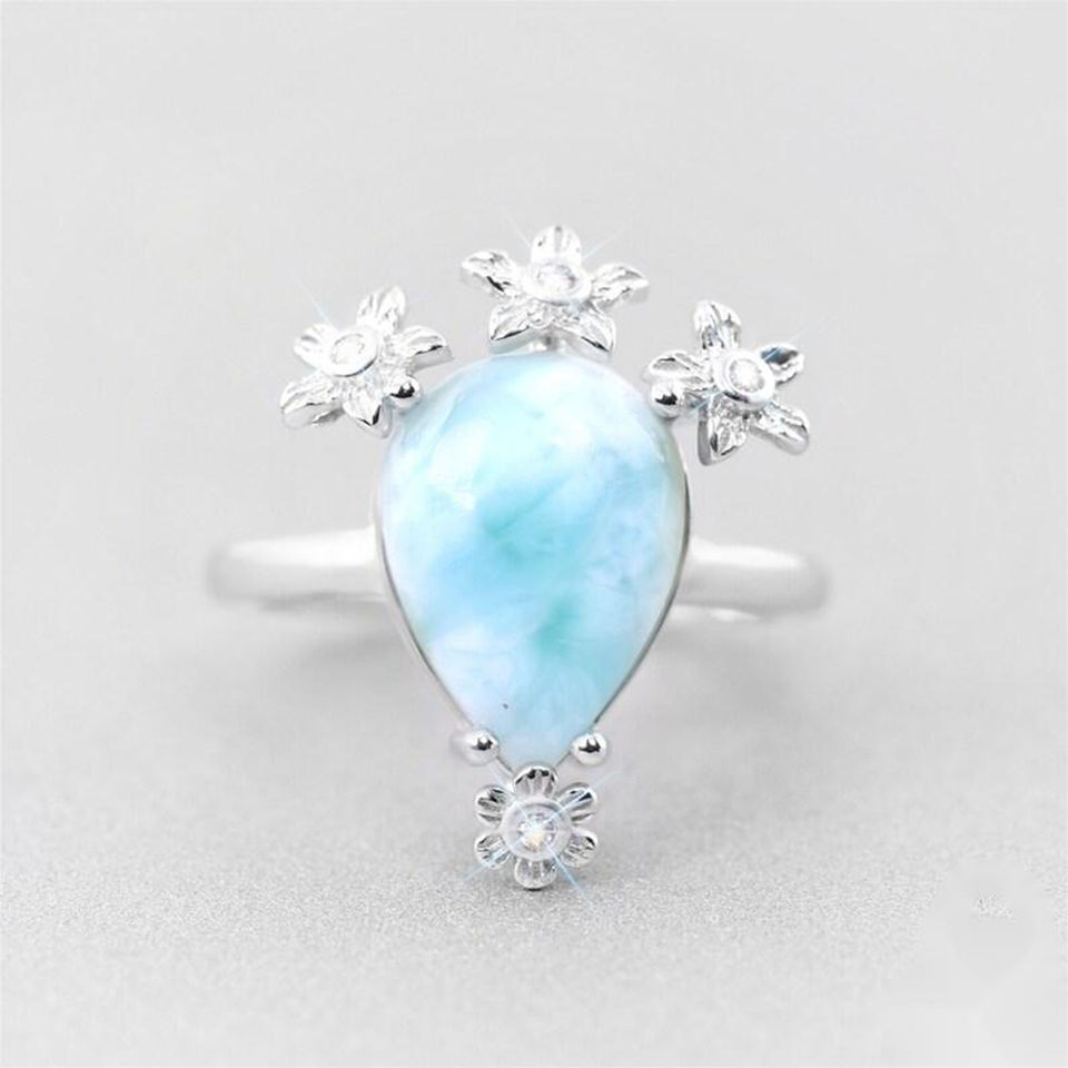 แหวนเงินแท้ S925 ดีไซน์เรียบง่าย ประดับพลอยทรงลูกแพร์ ลายดอกไม้เล็กๆ รอบแหวน ประดับด้วยลาร์ิมา