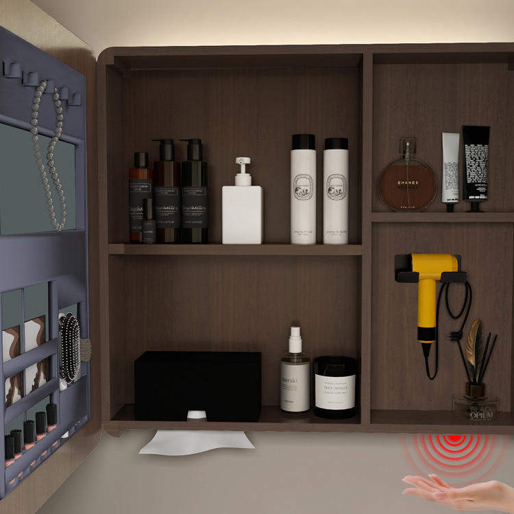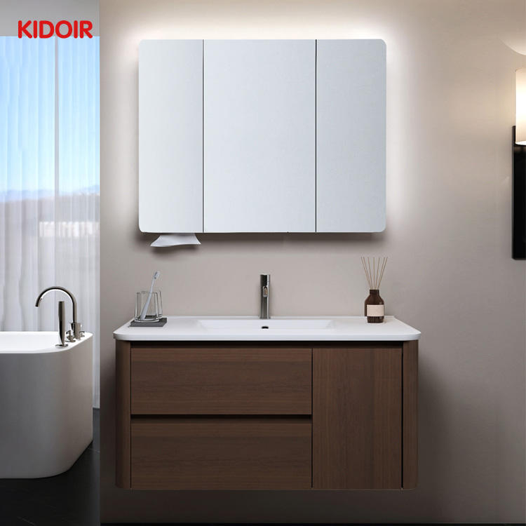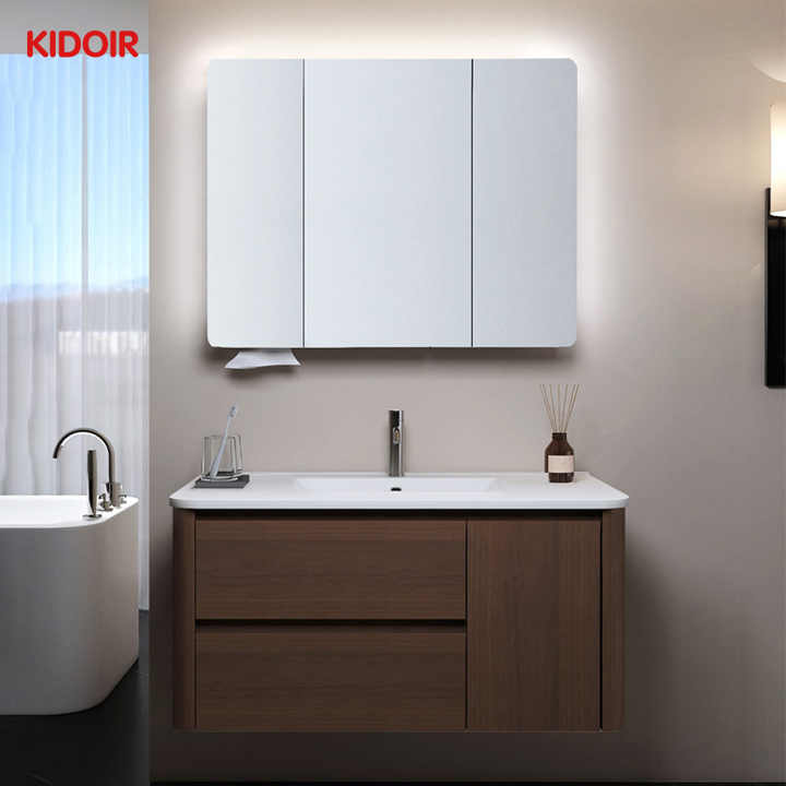 ตู้ห้องน้ำติดผนังแบบเรียบง่าย ดีไซน์จีน พร้อมไฟ LED กระจกเงา PVC ไม้อัด สำหรับบ้านและโรงแรม