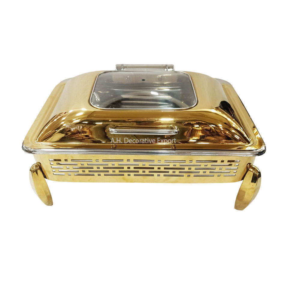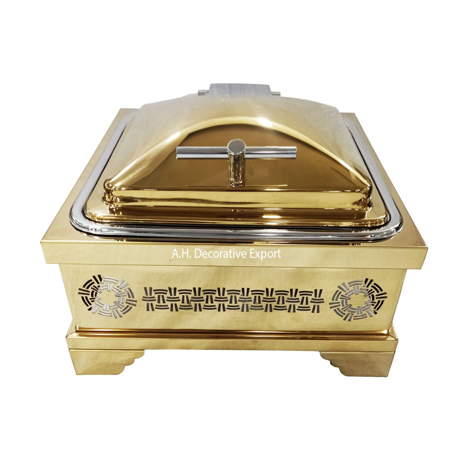 จานอุ่นอาหารสแตนเลสสตีลทรงสี่เหลี่ยมดีไซน์เรียบง่ายจานอุ่นอาหารพร้อมฐานตั้งและฝาปิด