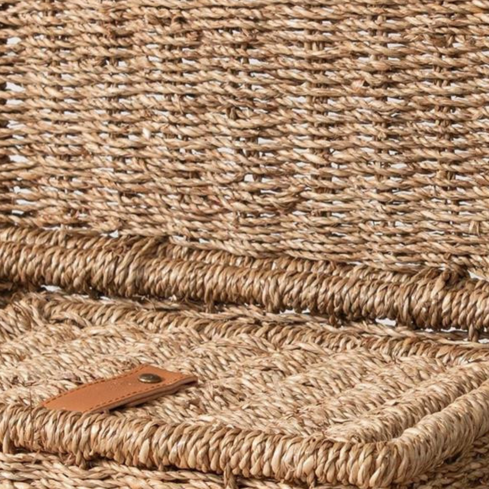 กล่องเก็บหญ้าทะเลทอดีไซน์เรียบง่ายหรูหราพร้อมสายหนังสําหรับจัดระเบียบบ้านและตกแต่งในราคาขายส่ง