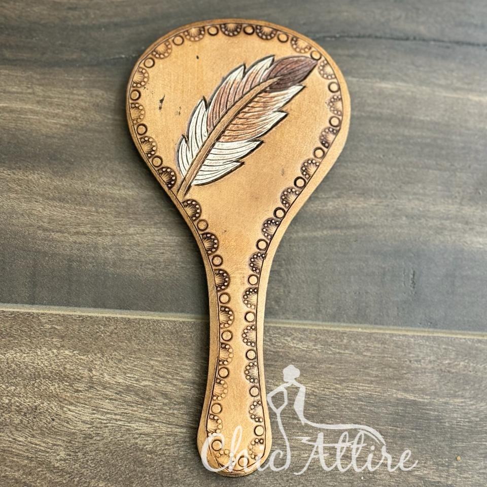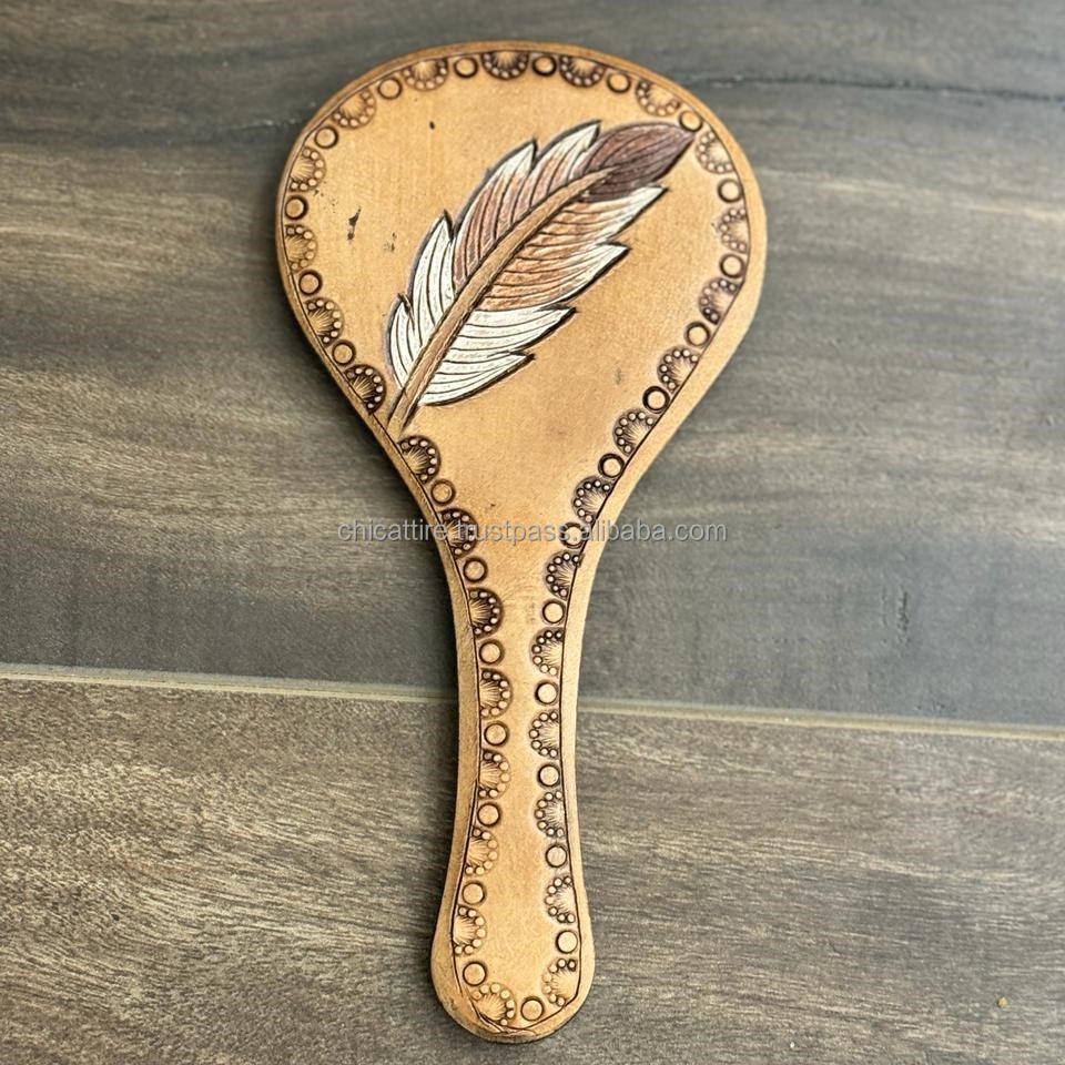 กระจกกระเป๋าที่จับแบบพกพาทำจากหนังแท้ที่เรียบง่ายและสง่างามอุปกรณ์แต่งหน้าแบบตะวันตกคาวบอยเกิร์ลตามสั่งคุณภาพสูง
