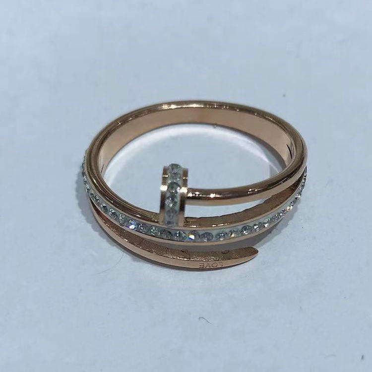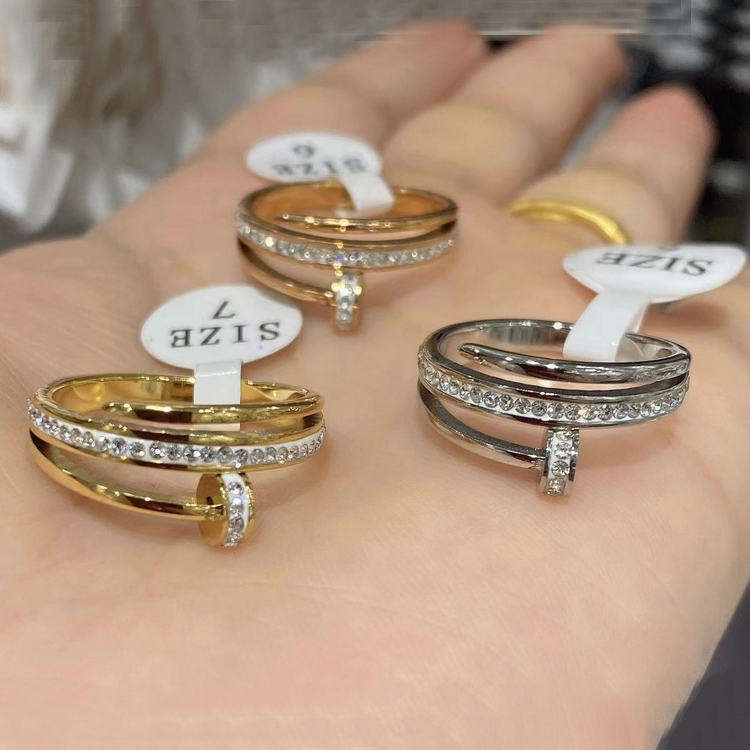 เครื่องประดับแบรนด์แฟชั่นเรียบง่าย สแตนเลสสตีล ชุบทอง 18K ประดับเพชรและเพทาย แหวนแต่งงานคลาสสิกสำหรับผู้หญิงและผู้ชาย