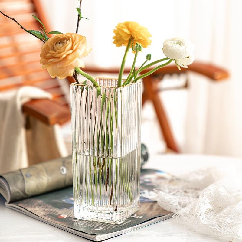 แจกันแก้วคริสตัลแนวตั้งปากสีทองแบบเรียบง่ายพร้อมรูปทรงกระบอกสี่เหลี่ยมลูกบาศก์สำหรับดอกไม้