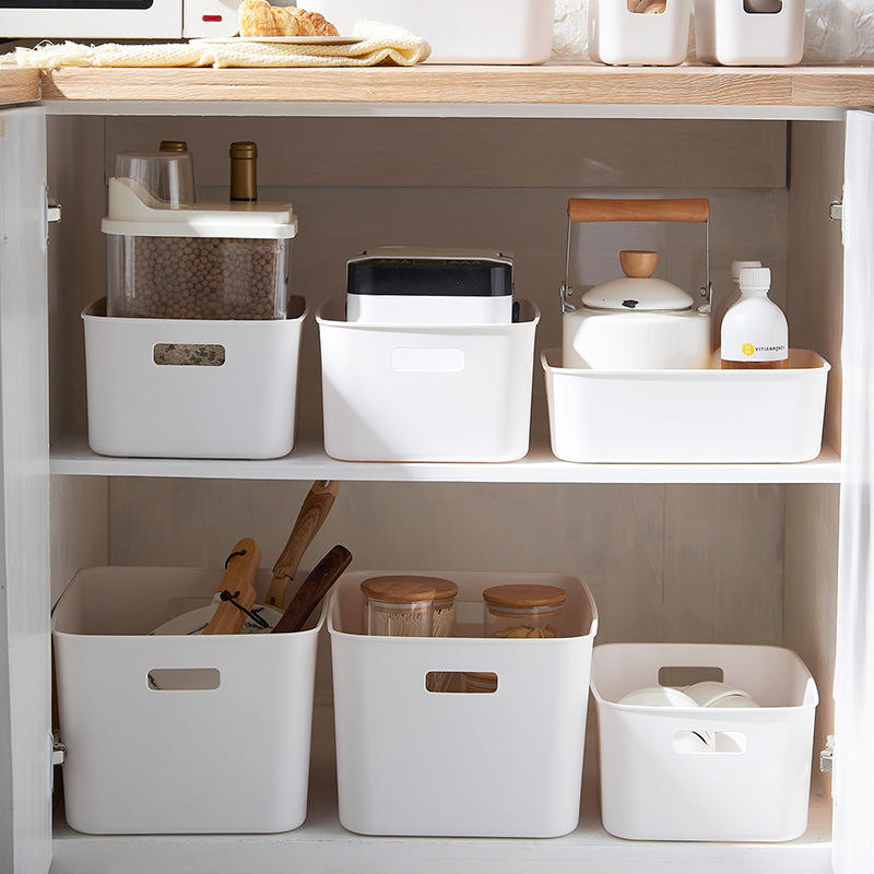 กล่องเก็บของพลาสติกทรงสี่เหลี่ยมแบบเรียบง่าย ไม่มีฝาปิด ซ้อนกันได้ ใช้จัดระเบียบบนโต๊ะ สำหรับบ้าน ห้องนอน ห้องนั่งเล่น
