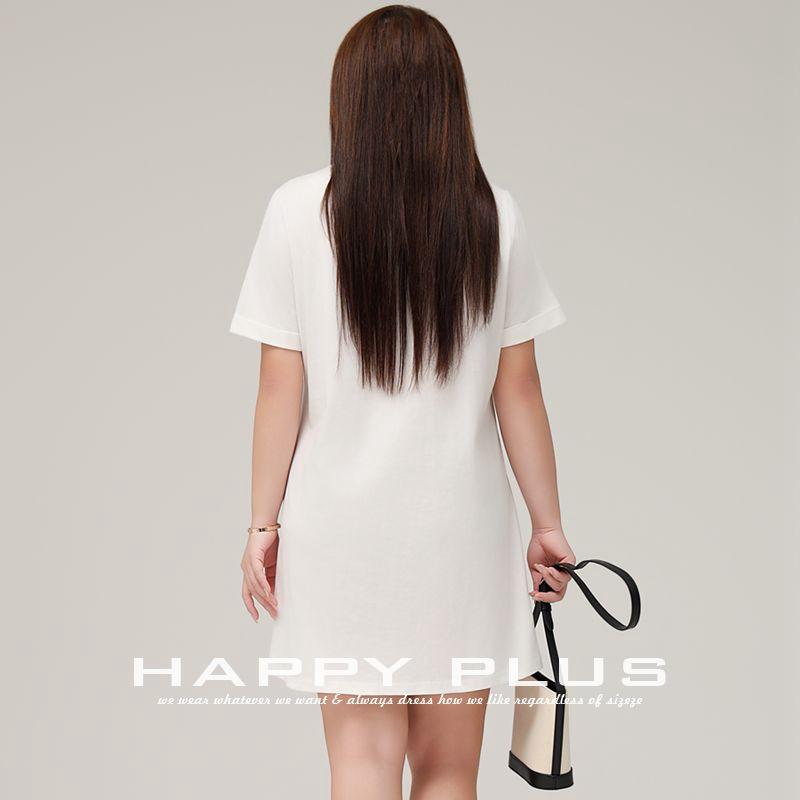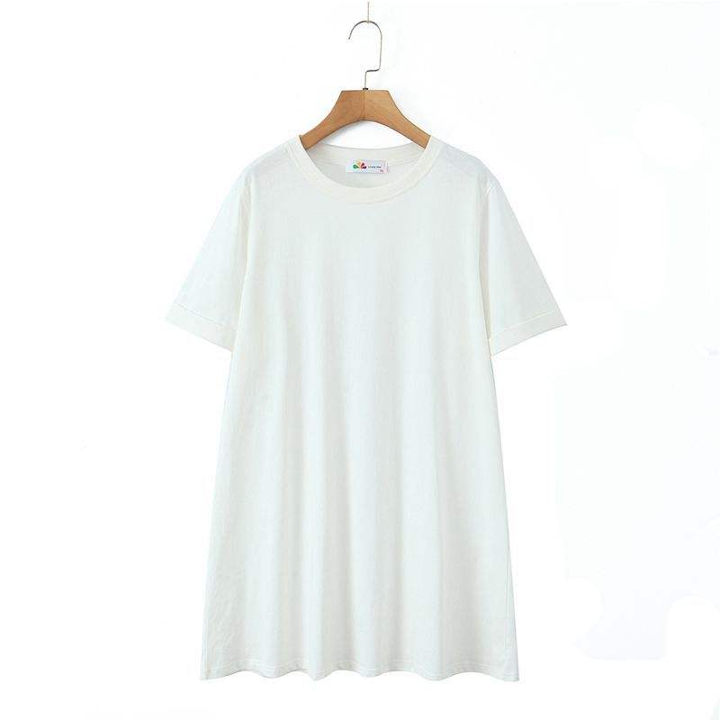 เดรสเสื้อยืดคอกลมผ้าฝ้ายเจอร์ซีย์สีขาวทรงหลวมเรียบง่ายสำหรับผู้หญิงไซส์พลัส สไตล์ลำลอง สีพื้น แขนสั้น