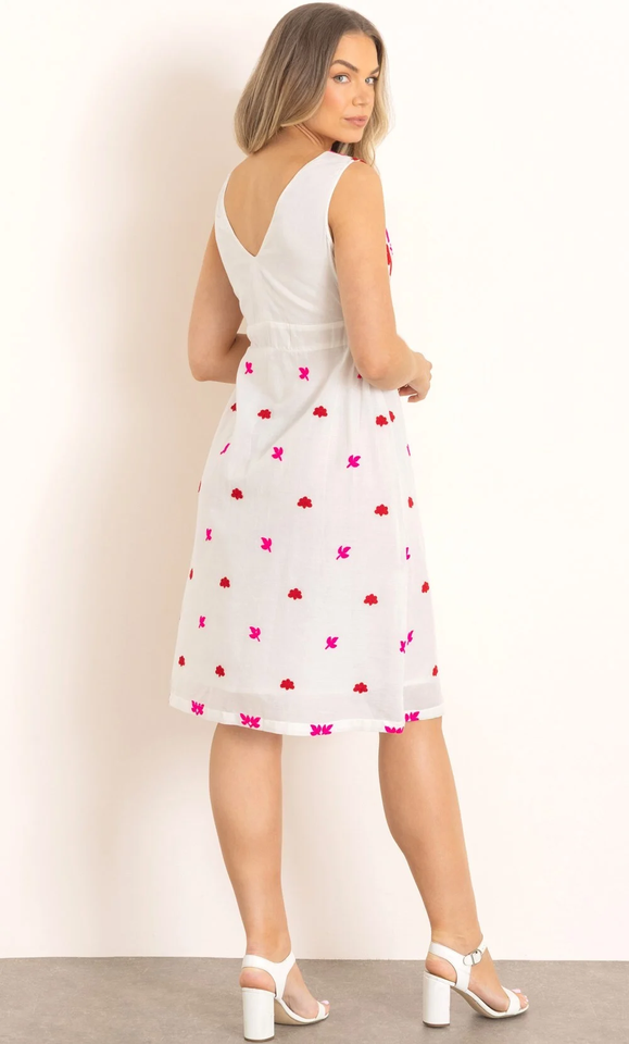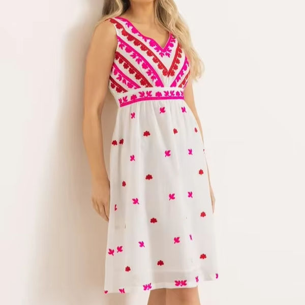 เดรสผ้าคอตตอนแขนกุดปักลายหรูหราเรียบง่ายคอตตอนคอเสื้อคอเสื้อทรงหลวมมีระบายปัก3D 3D ยาวถึงเข่าแบบเรียบง่าย