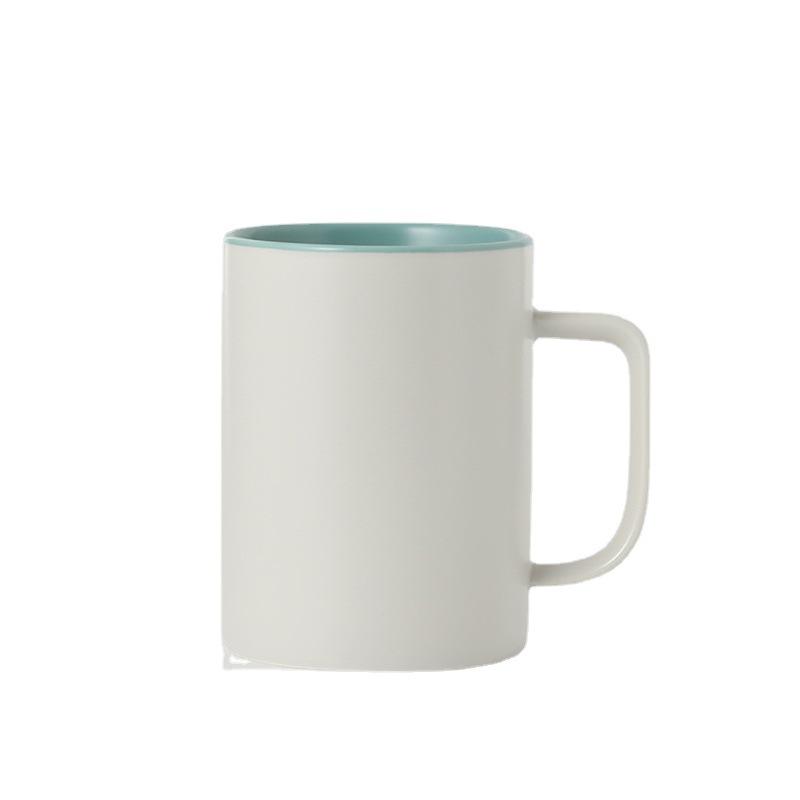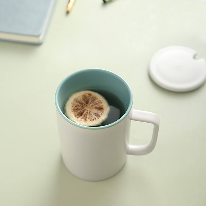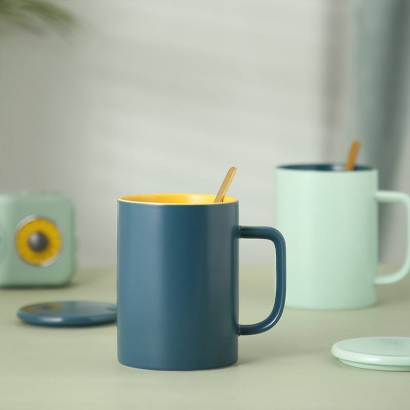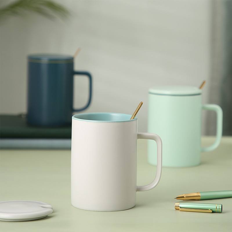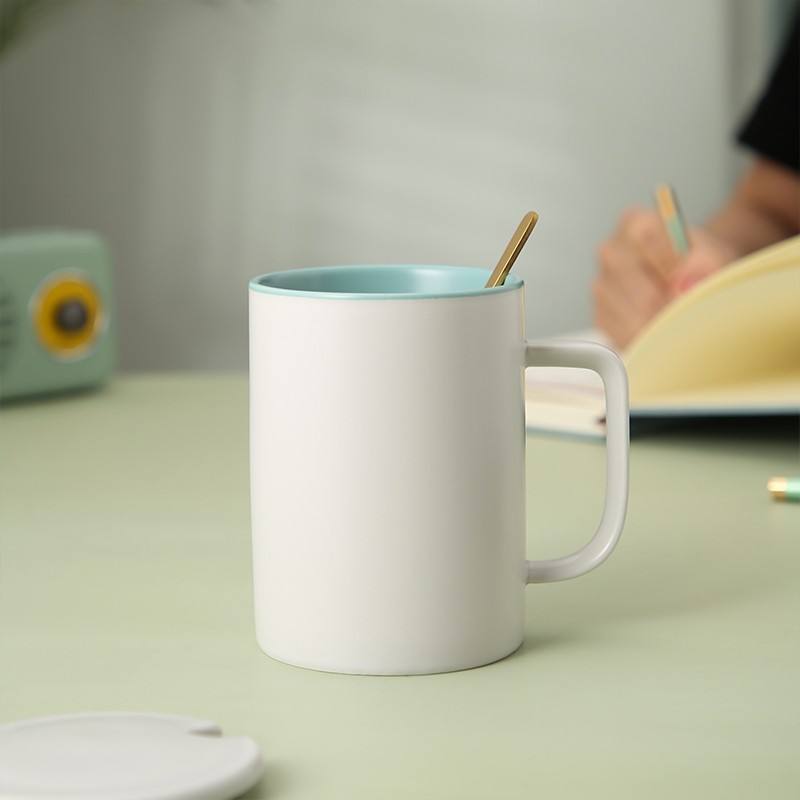 แก้วเซรามิกสีพื้นเรียบง่ายพร้อมฝาและช้อน ดีไซน์มินิมอลสำหรับกาแฟ ชา หรือเป็นของขวัญ