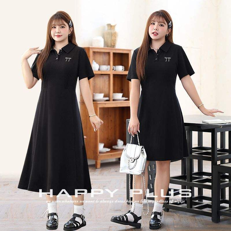 ชุดเดรสโปโลสีพื้นเรียบง่ายสำหรับผู้หญิงสวมใส่สบายๆ ทุกวันสีดำแขนสั้นเดรสยาวดีไซน์กระดุมเอวธรรมชาติ