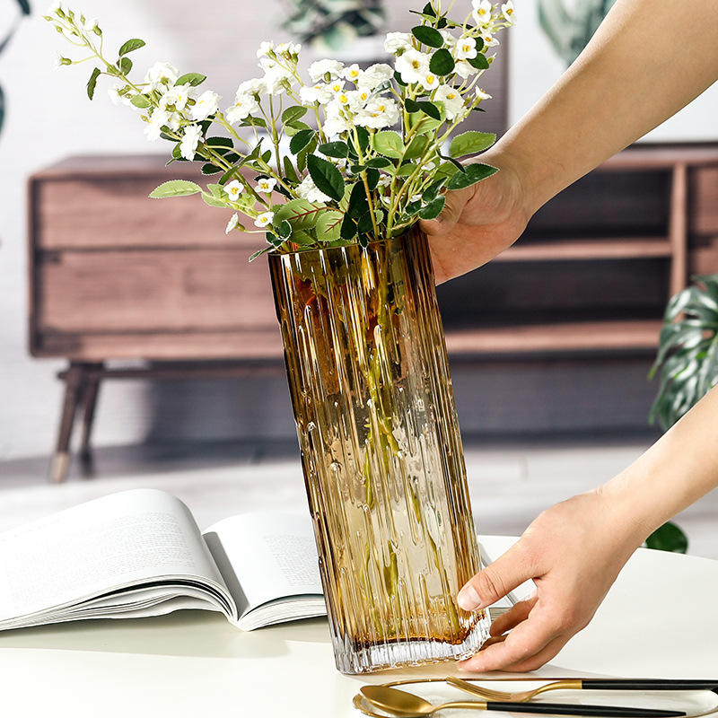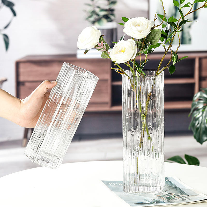 แจกันแก้วปากทรงสี่เหลี่ยมแบบเรียบง่ายลายทางแบบท่อตรง Dracaena sanderiana สำหรับดอกไม้สดตกแต่งโต๊ะไฮโดรโปนิกส์