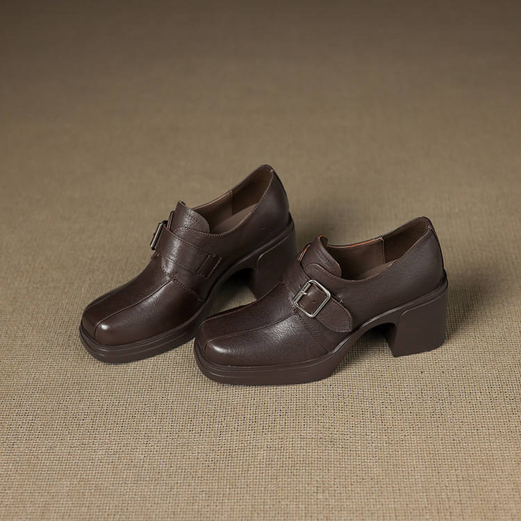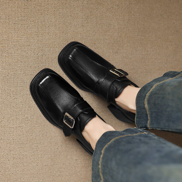 รองเท้าหนังแท้ทรงเหลี่ยมกันน้ำแบบเรียบง่าย ดีไซน์หัวเข็มขัดเดี่ยว แฟชั่นย้อนยุค สีพื้น พื้นนุ่ม ตัดเย็บแบบ Deep-Cut