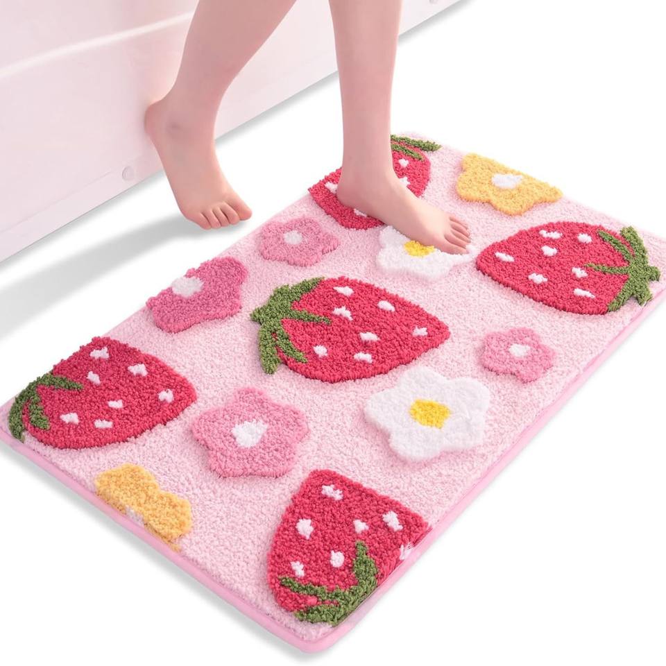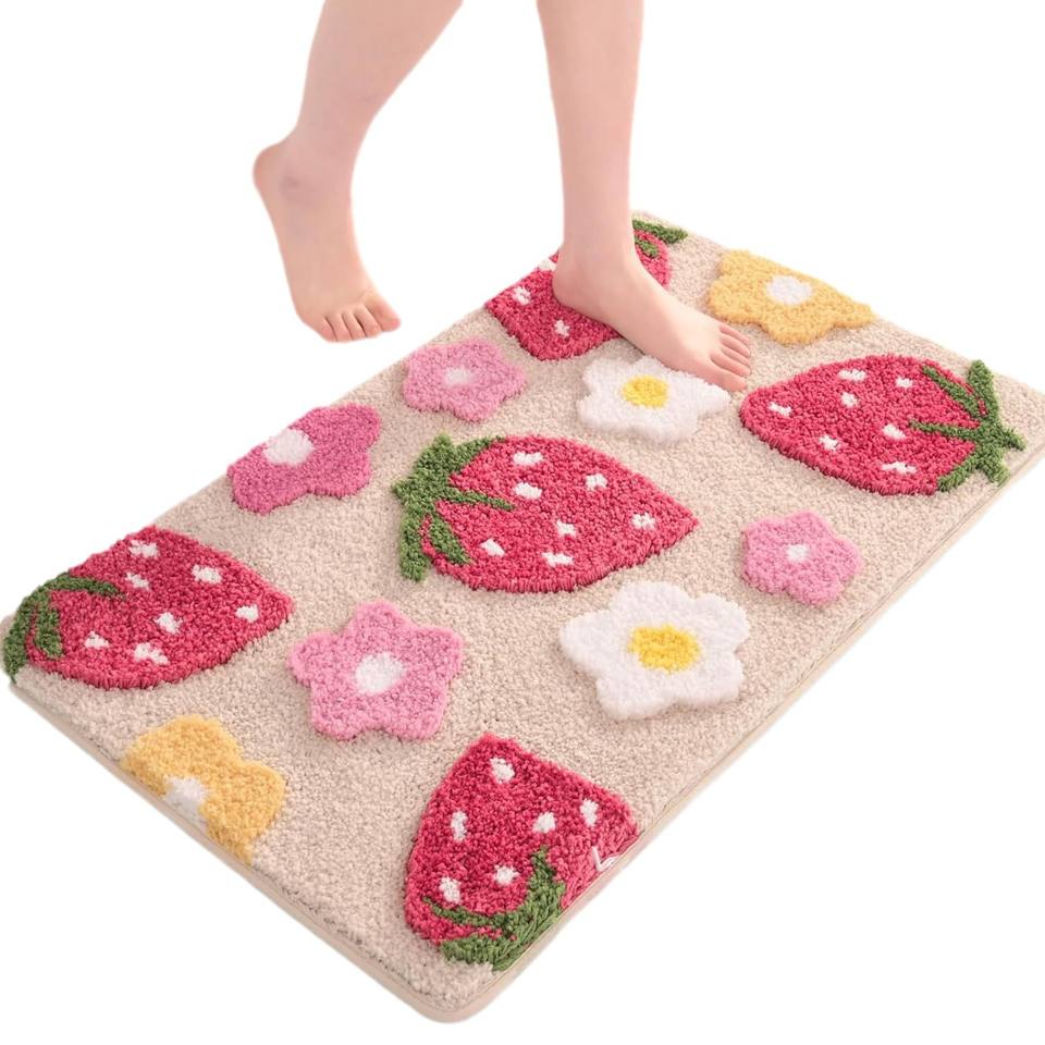 พรมเช็ดเท้าลายสตรอว์เบอร์รีเรียบง่าย รูปทรงสี่เหลี่ยมผืนผ้า กันลื่น ซึมซับน้ำได้ดี ซักเครื่องได้ ดีไซน์แปลกใหม่สำหรับห้องน้ำ