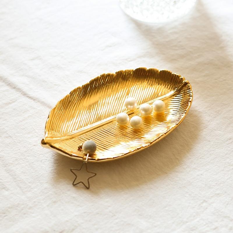 จานเก็บของเซรามิกสีขาวลายใบไม้สีทองเรียบง่าย ถาดใส่เครื่องประดับต่างหู ของตกแต่งบ้าน