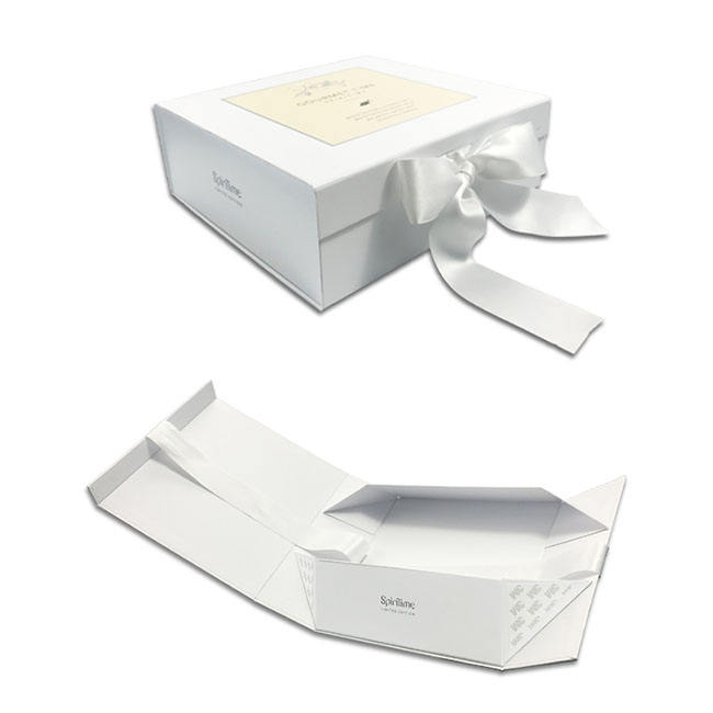 กล่องของขวัญพับได้สีขาวแบบเรียบริบบิ้นกล่องของขวัญที่เก็บเสื้อผ้าแบบปิดด้วยแม่เหล็กวัสดุกระดาษเคลือบ UV สลักลายนูน