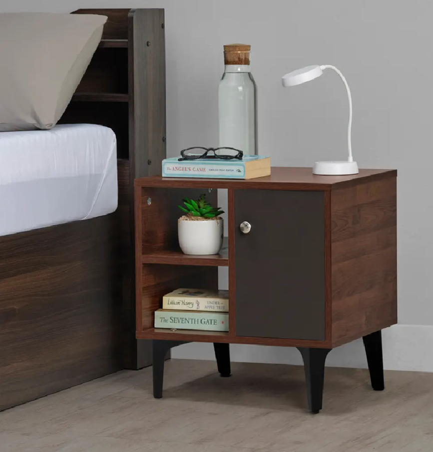 Simple dark wood grain bedside table with two clean-line drawers. Available at wholesale prices.