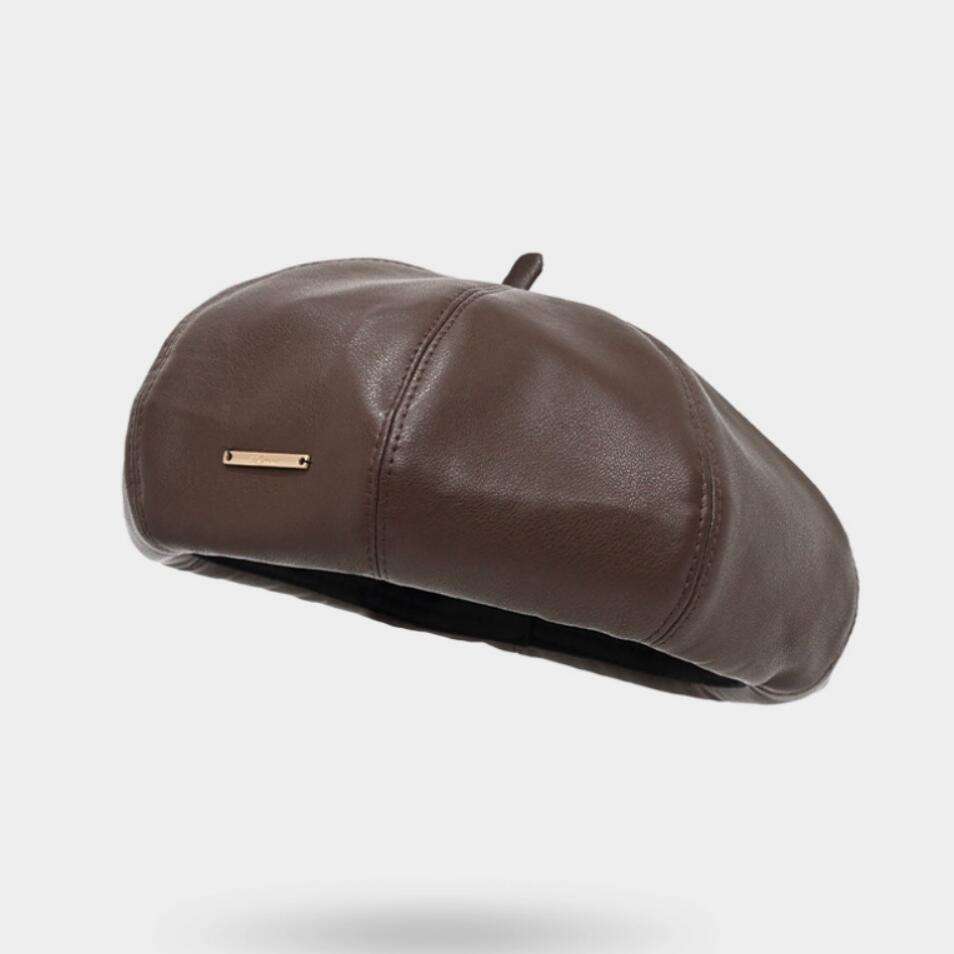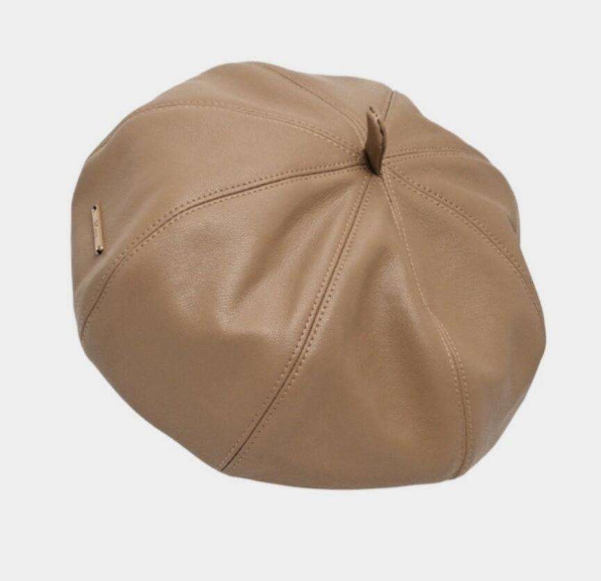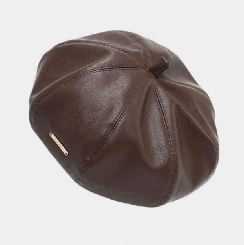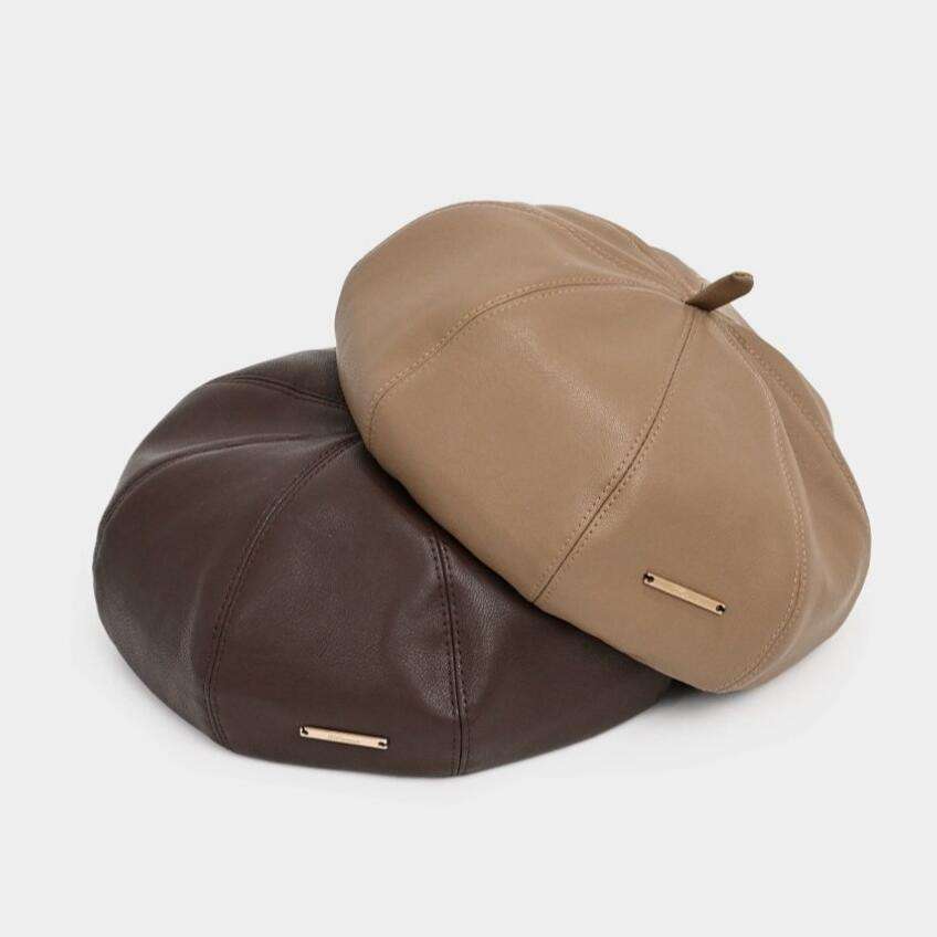 หมวกเบเร่ต์โลโก้โลหะเรียบง่ายทรงยาว หมวกหนัง PU สำหรับฤดูหนาว หมวกจิตรกร